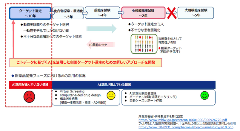 創薬支援ビジネスの市場規模は2026年に314億米ドル1)(約4.1兆円*)に上ると推計され、特に、革新的新薬の開発に向けた研究の最上流であり、創薬の成功率に大きな影響を与える標的選定/評価の市場規模は70.8億米ドル1)(約9200億円*)に達すると予測されています。半面、厚生労働省は、医薬品開発におけるAI活用が推進される中、この標的選定のプロセスにおいてはAIの活用が進んでいないことを課題視しています2)。