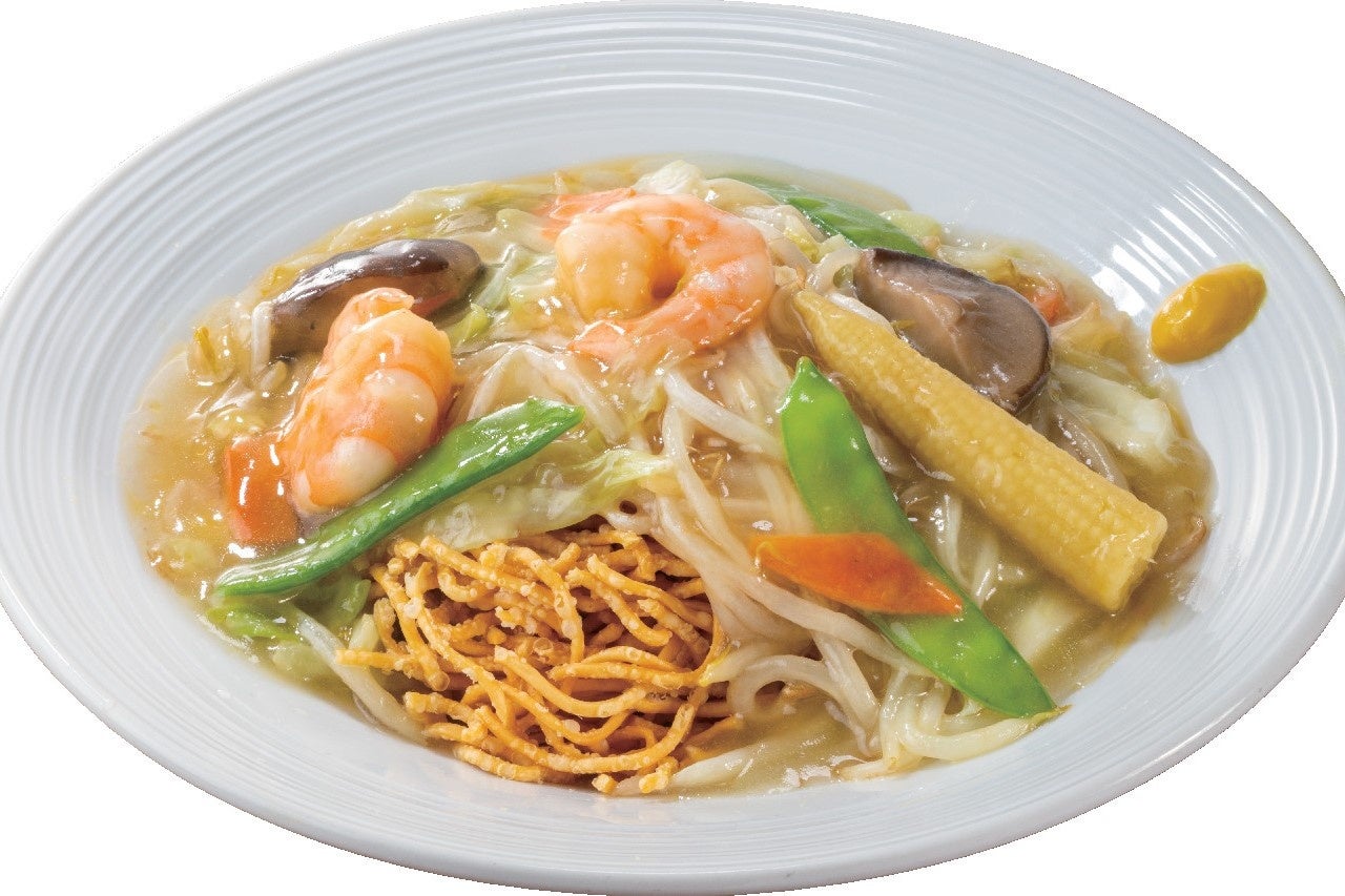 お酢やからしでの味変もおすすめ!やさしい塩味のあんかけソースがさっぱりとした味わいのかた焼そばです。