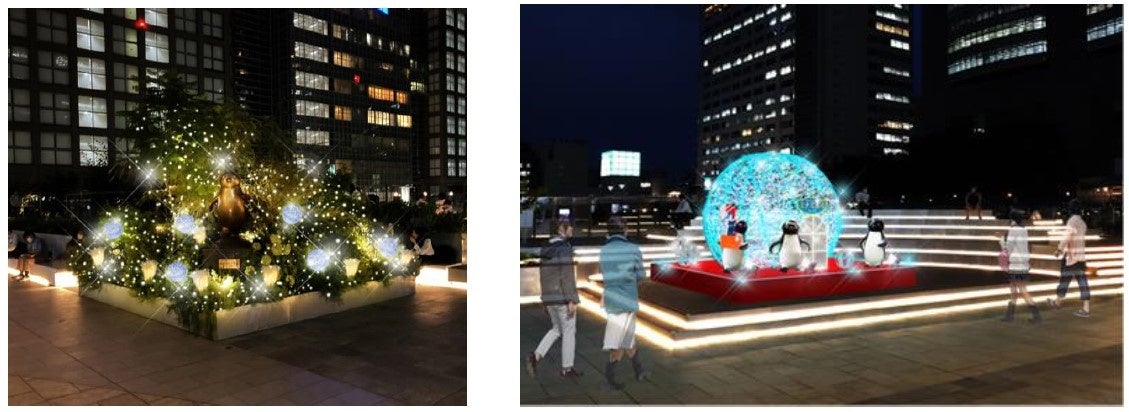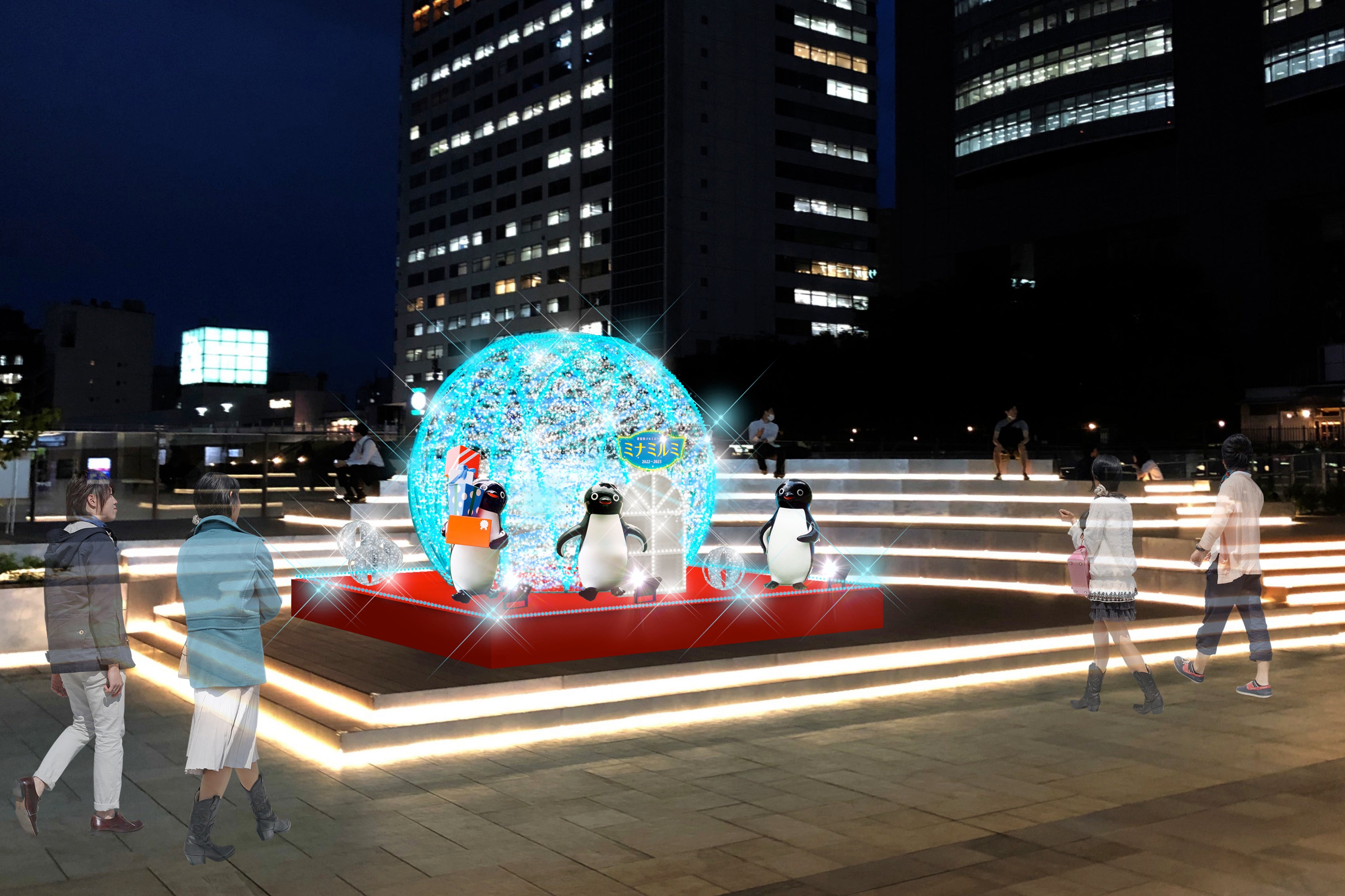 JR新宿駅新南改札出て直ぐのSuicaのペンギン広場では、各所へゴールドを基調とした光の装飾の他、ステージ部分にはスノードーム状のお家とSuicaのペンギン像を設置し、訪れた人たちが思わず笑顔になってしまうような心温まる幻想的な光の空間をお届けします。
