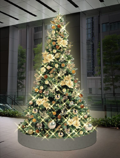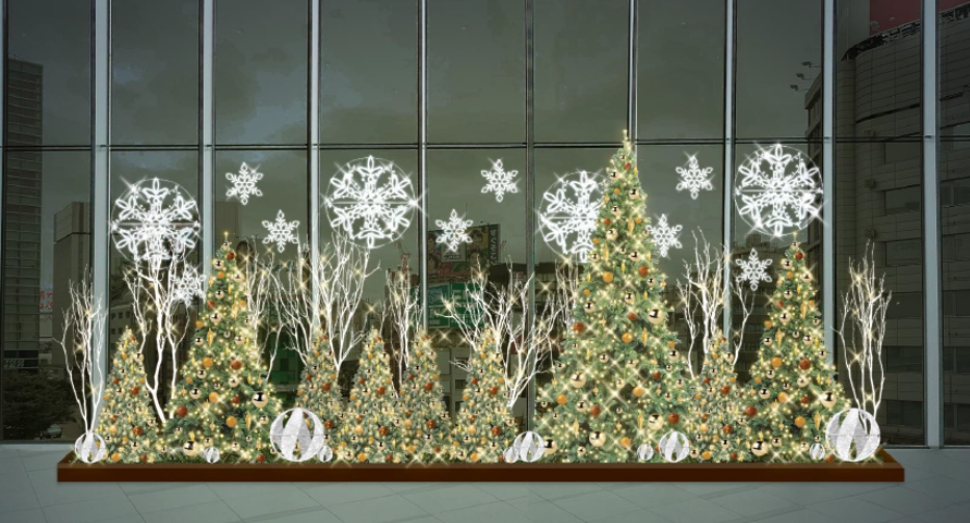 麗らかな金色を纏った連なるツリーと冬の森のワンシーンを連想させる数々の白枝、それらを照らすように降り注ぐ雪の結晶と、足元のスノーボール、様々な光が入り混じり、暖かみのある都会的なクリスマスを演出いたします。