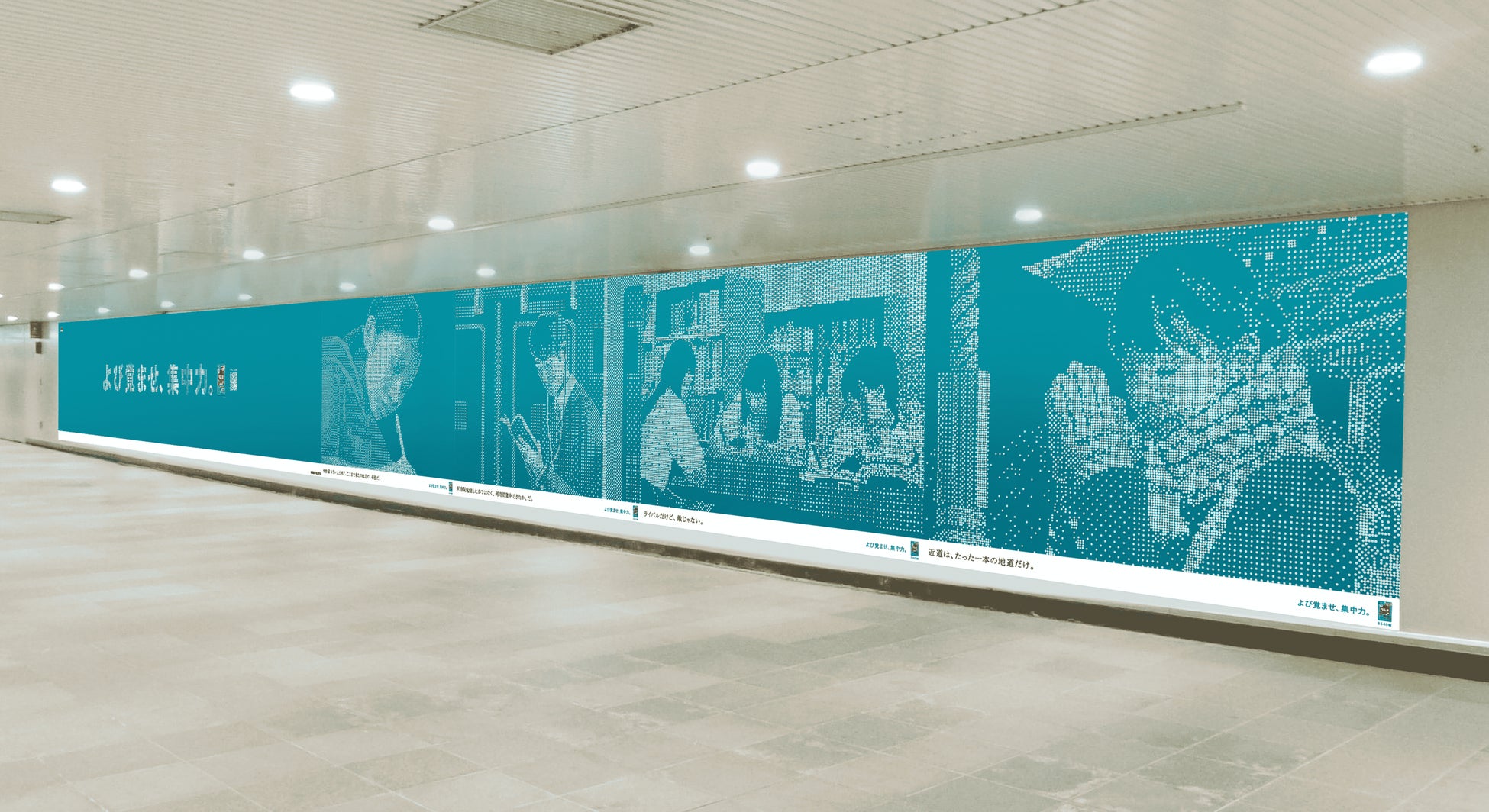 今回の交通広告は体育館を貸し切り、森永製菓社員と制作スタッフによって、39,061粒のラムネ(大粒ラムネ)を1つ1つ手作業で並べて制作しました。ミスが許されない、集中力を要する作業。ラムネを食べながら集中し、10時間をかけ4種のデザインおよび、『よび覚ませ、集中力。』の文字(大小2種)を仕上げました。これまで勉強に励む受験生の”集中のお供”として寄り添ってきた「森永ラムネ」からの、応援のしるしとして制作に臨みました。撮影で使用したラムネは制作に携わった社員、スタッフがおいしくいただきました。