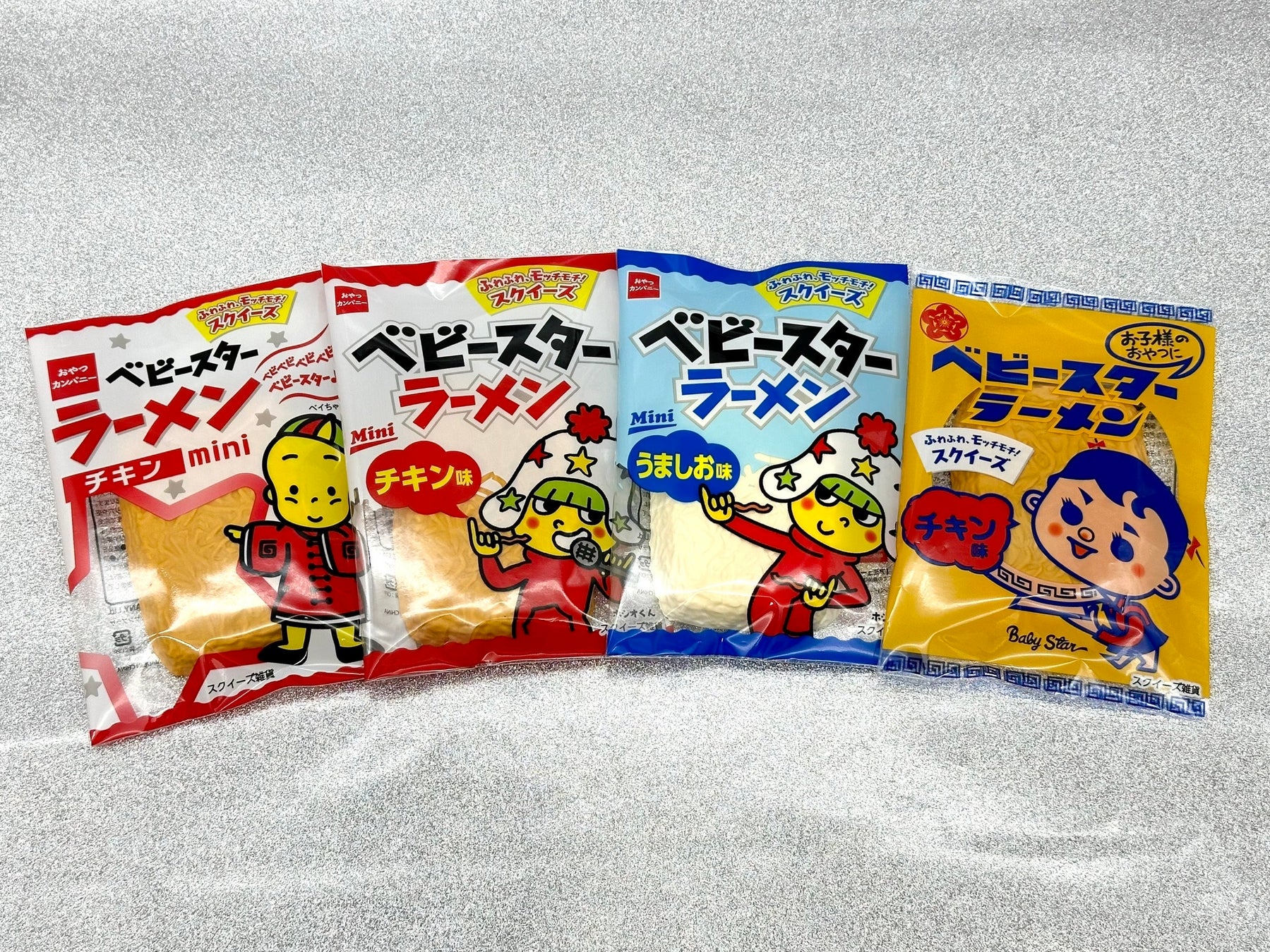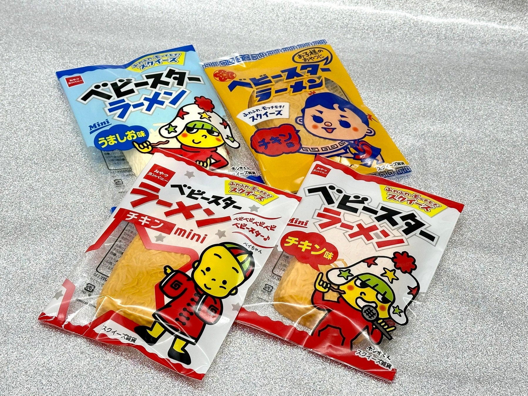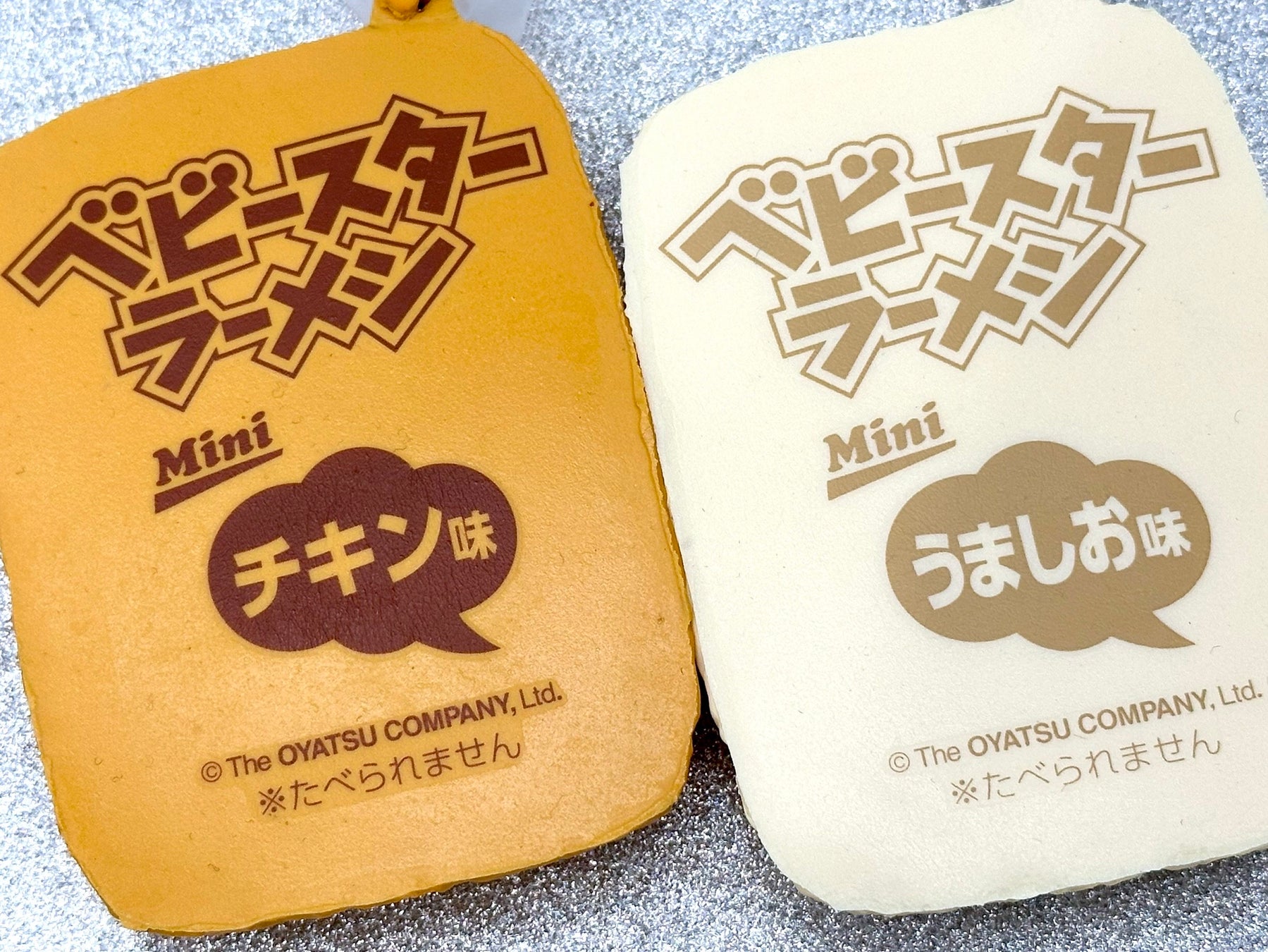 ベビースターのパッケージと麺をリアルに再現した『ベビースターラーメン スクイーズ』は全4種類!おなじみの3代目ベビースターキャラクター「ホシオくん」に加えて、大人世代には懐かしい初代・2代目ベビースターキャラクターのレトロパッケージも登場。ベビースターなのにふわふわモッチモチの感触がやみつきになる麺は「チキン味」と「うましお味」の2種類。
