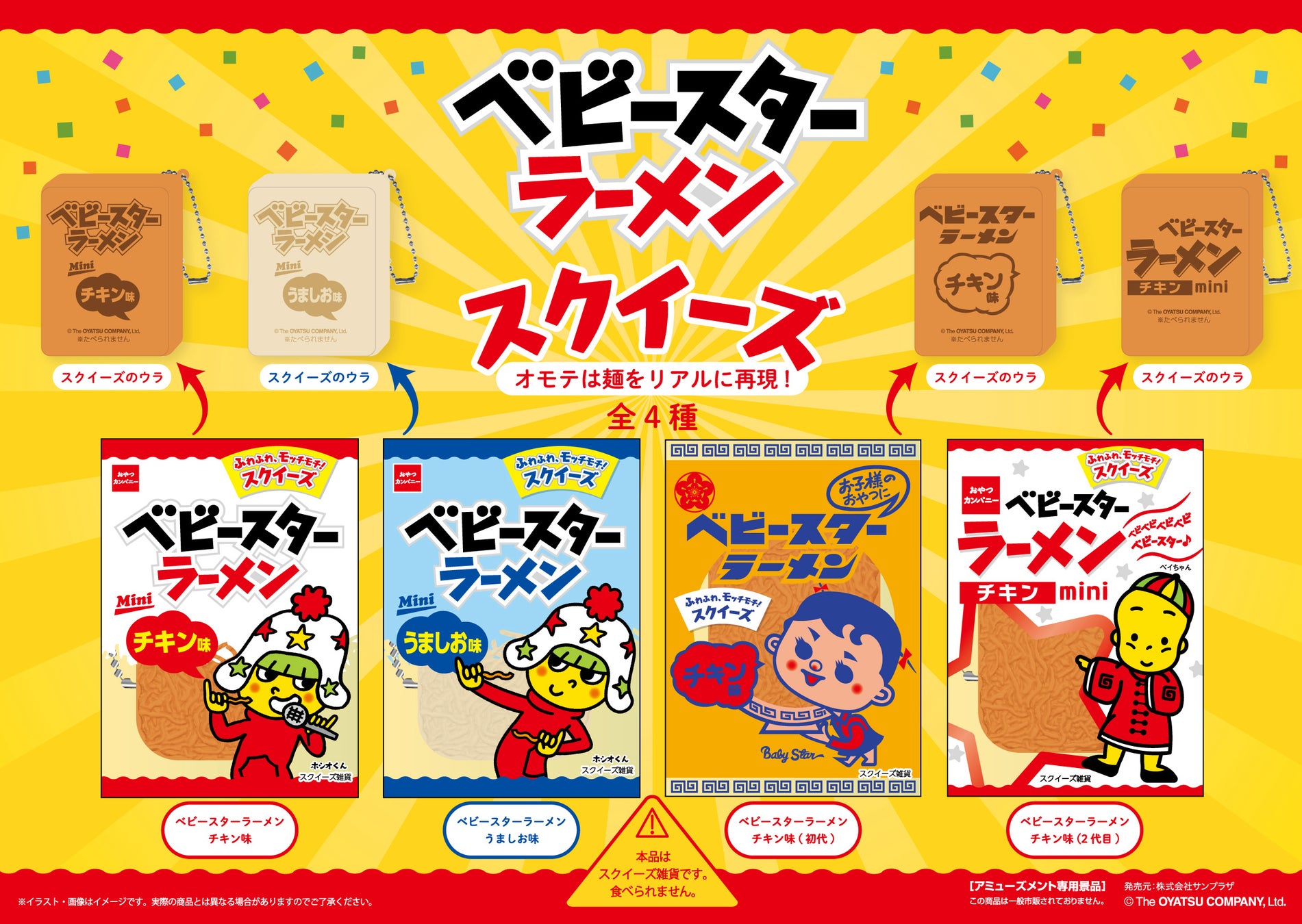 アミューズメント景品『ベビースターラーメン スクイーズ』の詳細および取り扱い店舗は、特設サイトをご確認ください。