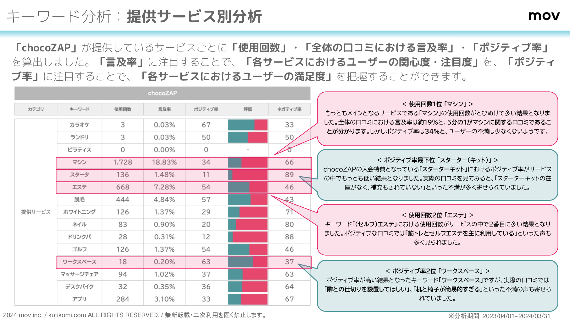「chocoZAP」が提供しているサービスごとに「使用回数」・「全体の口コミにおける言及率」・「ポジティブ率」を算出しました。