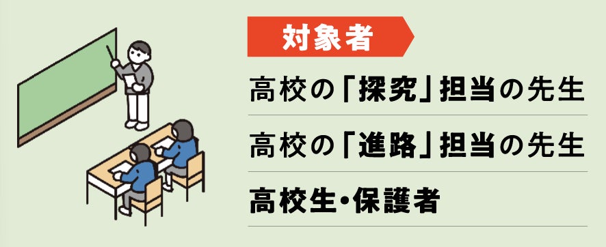 2025年3月8日(土)~3月30日(日) 会場:大阪・神戸・京都・福岡・名古屋・静岡 定員:60~90名(事前予約制) 対象者:高校の「探究」「進路」担当の先生/高校生・保護者