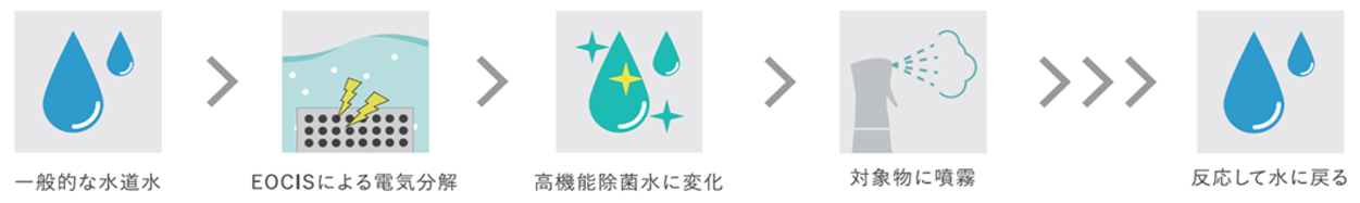 「EOCIS」とは、内部に組み込まれた特殊電極に最適な電圧をかけ、水道水を電気分解することで、除菌・消臭・防カビ・アレルゲン除去効果を持った“高機能除菌水“に一時的に変化させる技術です。