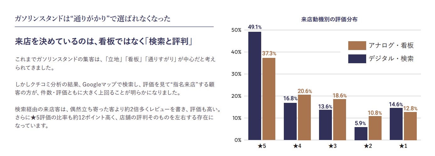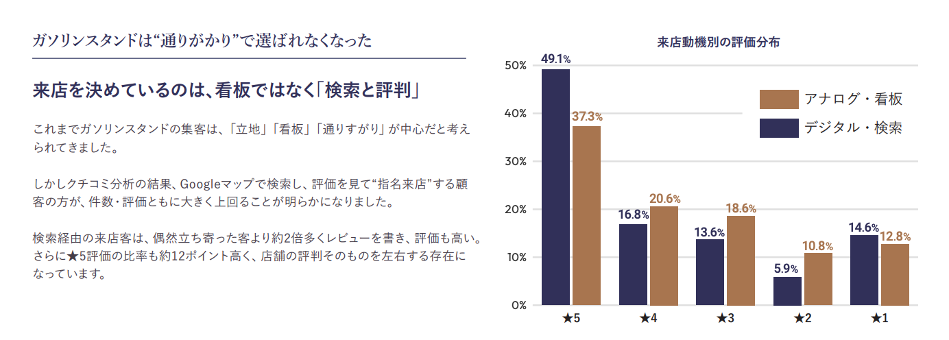 クチコミを分析した結果、1円でも安い価格や看板の目立ちやすさといったハード面だけでなく、スタッフの接客やネット上での評判といったソフト面が、店舗の評価と集客を大きく左右していることが分かります。