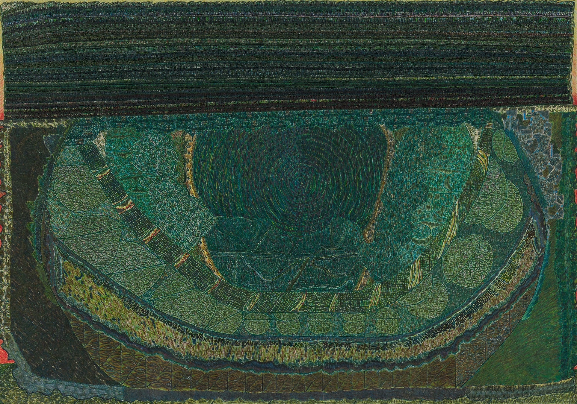 深いエメラルドグリーンを基調に、青緑や黄緑、くすんだオリーブの色層が幾重にも重なり、画面には水面をのぞき込むような静かな奥行きが生まれている。中央にゆるやかに弧を描く形態は、器の縁のようでもあり、地形の輪郭のようでもあり、見る者の記憶や感覚に静かに触れる。同時に、この作品は詩的で穏やかな印象をたたえながらも、形態の輪郭や色面の関係は驚くほどシャープでクリーンである。細かな線や点の反復は、遠くでかすかに響く音のようなリズムを生み、画面に精緻な秩序を与えている。静けさと明晰さが高い次元で共存する造形の強度を評価し、本作をグランプリに選出した。