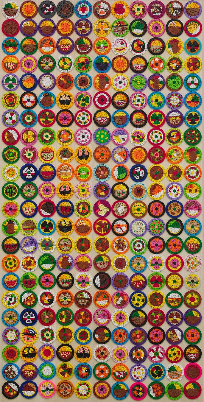 絵を描くことに幼いころから関心を示し、寡黙ながらひたむきに制作に向き合うカー・ハンを、両親は温かく支えてきた。当初はパステルや絵の具を用いていたが、ほどなく、自身の制作スタイルには、色鉛筆がより適していることに気づく。描き続けるにつれて作品はさらに洗練され、徐々に抽象性を増していく。大きな白い紙の上に鋭く削った色鉛筆を用いて、幾層にも色を重ねる。何か月にもわたり、深い集中力とエネルギーをもって描き続けることで、作品は次第に鮮やかな輝きを帯びていく。そうして生み出された形象の連なりは、布地や絨毯、あるいは刺繍を思わせる趣を感じさせる。