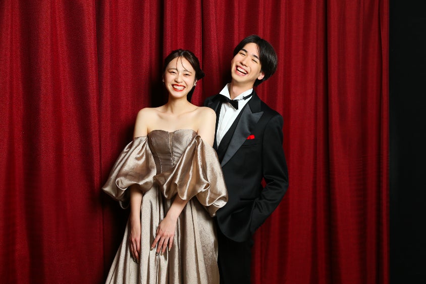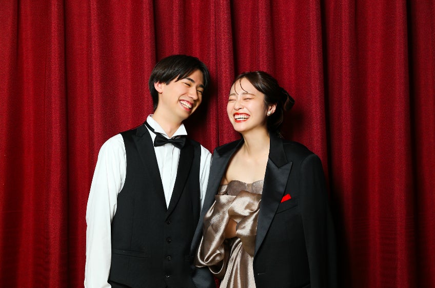 赤いカーテンを使用し赤と黒のビターな色合いでスタイリッシュなスタイルですが、2人で笑い合ったりジャケットを着せたりと今の二人の表情を引き出す撮影でキュートさをプラス。