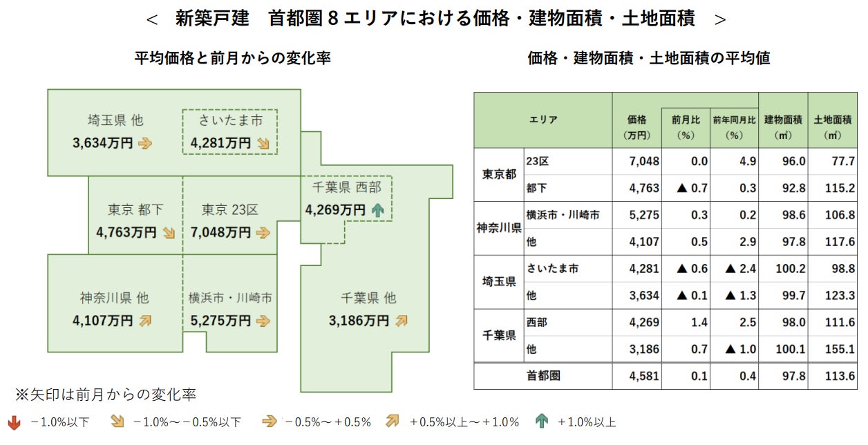●首都圏の新築戸建の平均価格は4,581万円で、前月比+0.1%と3カ月連続で上昇。前年同月比は+0.4%と2カ月連続で上昇。