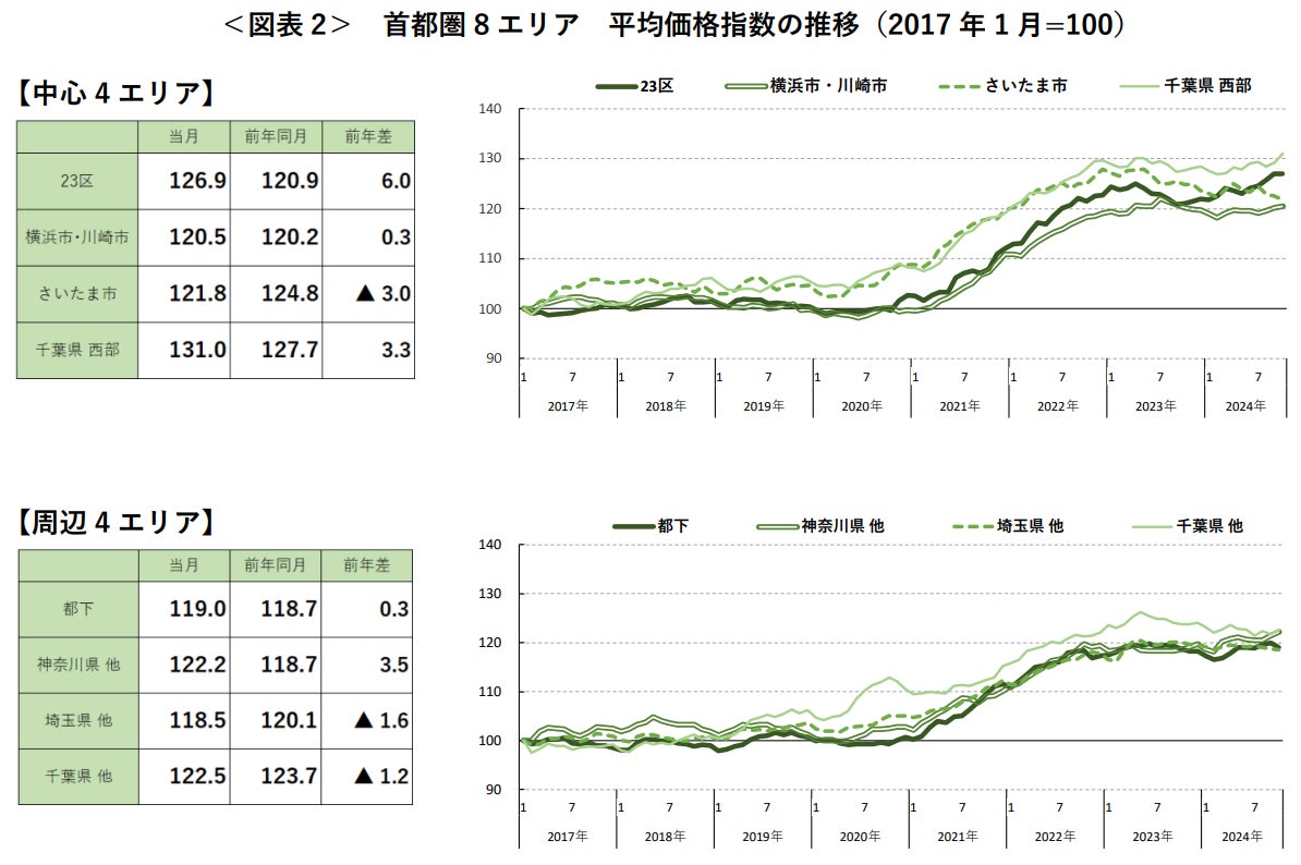 首都圏全体の平均価格は前月比+0.1%と3カ月連続で上昇した。また、前年同月比は+0.4%と2カ月連続で前年同月を上回った。