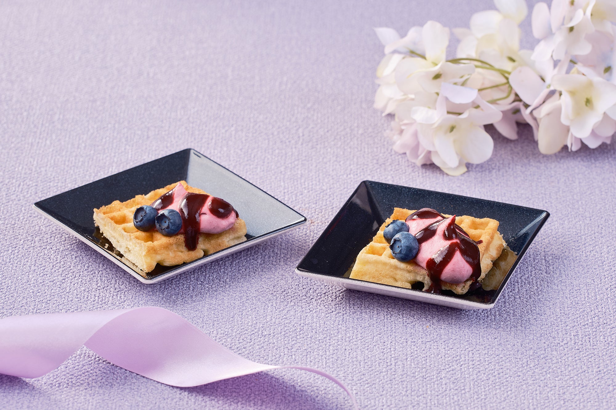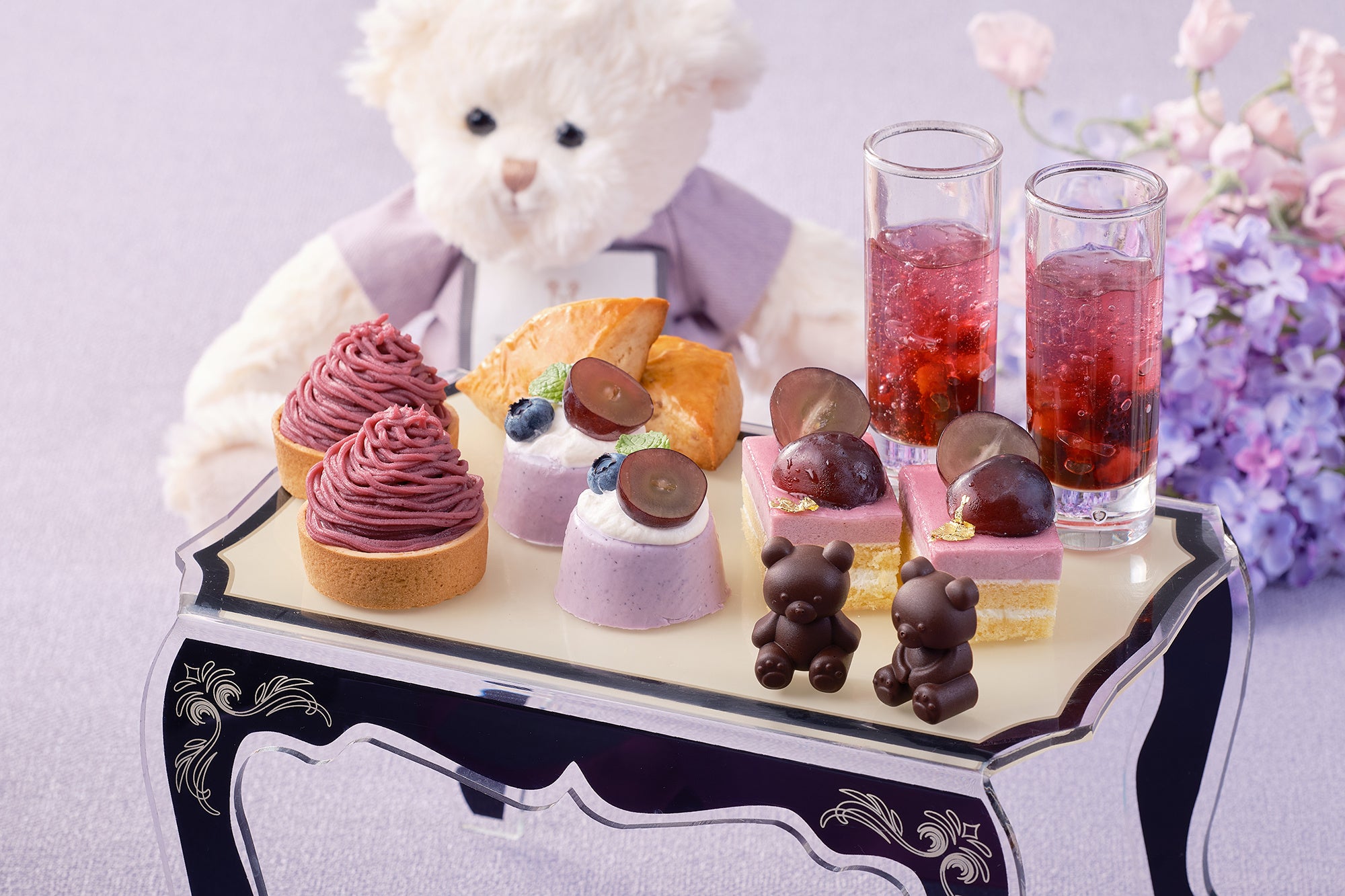 ベリーと巨峰のゼリー/ブルーベリーチーズケーキ/巨峰ムース/紫芋タルト/マロンスコーン/ストリングス ベア ショコラ/ワッフル カシスホイップ&ソースとブルーベリー添え
