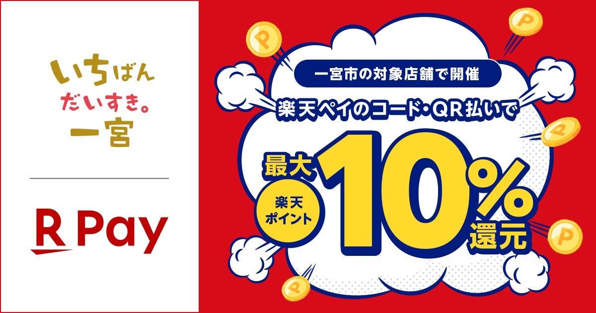 楽天ペイメント株式会社(以下「楽天ペイメント」)は、運営するキャッシュレス決済サービス「楽天ペイ」において、愛知県一宮市が2024年10月1日(火)から10月31日(木)まで実施する「10月!短期決戦!楽天ペイでお得に楽しむ一宮の秋♪ 最大10%還元キャンペーン」に参加することをお知らせします。