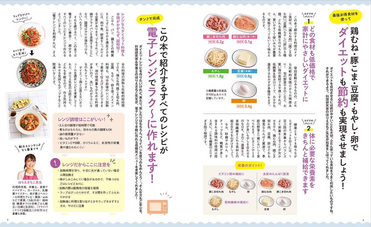 本書ではお買い得食材の「鶏むね肉」「豚こま切れ肉」「豆腐」「もやし」「卵」を活用し、レンジ調理で簡単においしく作れる糖質オフのおかずレシピを紹介します。主菜も副菜も汁物も作れるから、献立にできて満足度も栄養バランスも満点。ひと目でわかるアイコンがついているので、おかず選びに迷わず作れます。