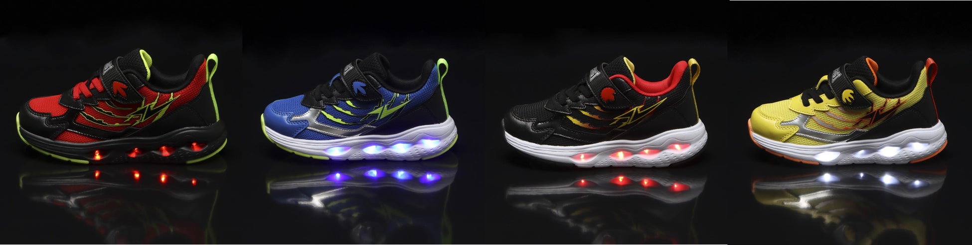 恐竜の目を想起させるようなライトを、アウトソールに搭載。歩くたびに光るため、暗い夜道でも安心して履いていただけます。