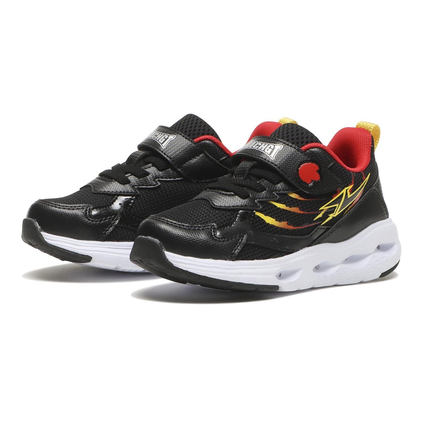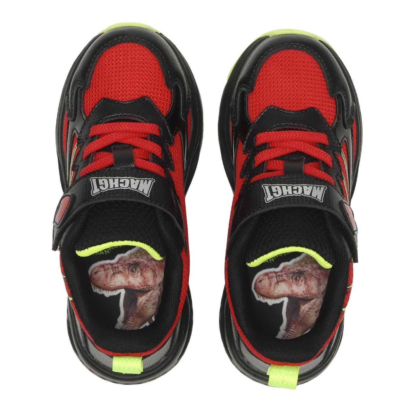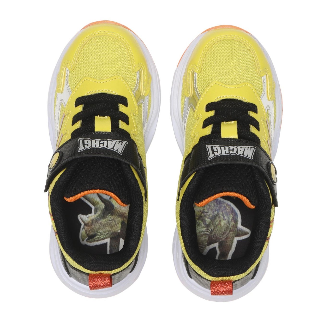 コラボスニーカーはティラノサウルスやトリケラトプスなど、4種の人気恐竜の特徴をデザインに落とし込んだ迫力のあるスニーカーです。シューズのボディには恐竜の爪痕のイラストを施し、ベルト部分には各恐竜にあわせた足あとのアイコンも添えられ、恐竜好きにはたまらないエッセンスを詰め込んだスニーカーとなっています。さらに、アウトソール横に付いたライトが歩くたびに光るため、暗い夜道でも安心です。デザイン性はもちろん、取り外して洗浄可能なインソールや、蒸れを軽減してくれるメッシュ素材のアッパーやライニングなど機能性にも優れています。