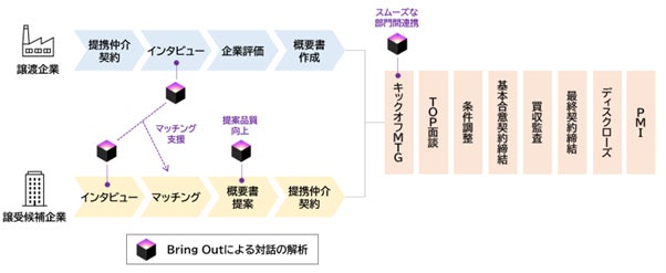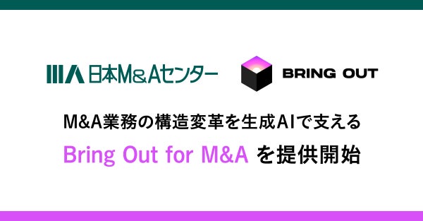 株式会社日本M&Aセンターホールディングス(本社:東京都千代田区 / 代表取締役社長:三宅 卓)の連結子会社である株式会社日本M&Aセンター(以下、日本M&Aセンター / 本社:東京都千代田区 / 代表取締役社長:竹内 直樹)と、AIを活用した対話データ解析サービスを提供する株式会社ブリングアウト(以下、ブリングアウト / 本社:東京都中央区 / 代表取締役社長:中野 慧)は、M&A業務全体における“対話”を起点に、生成AIを活用してより高次元なコンサルティングの提供を支援する「Bring Out for M&A(β版)」を開発し、運用を開始したことをお知らせいたします。
