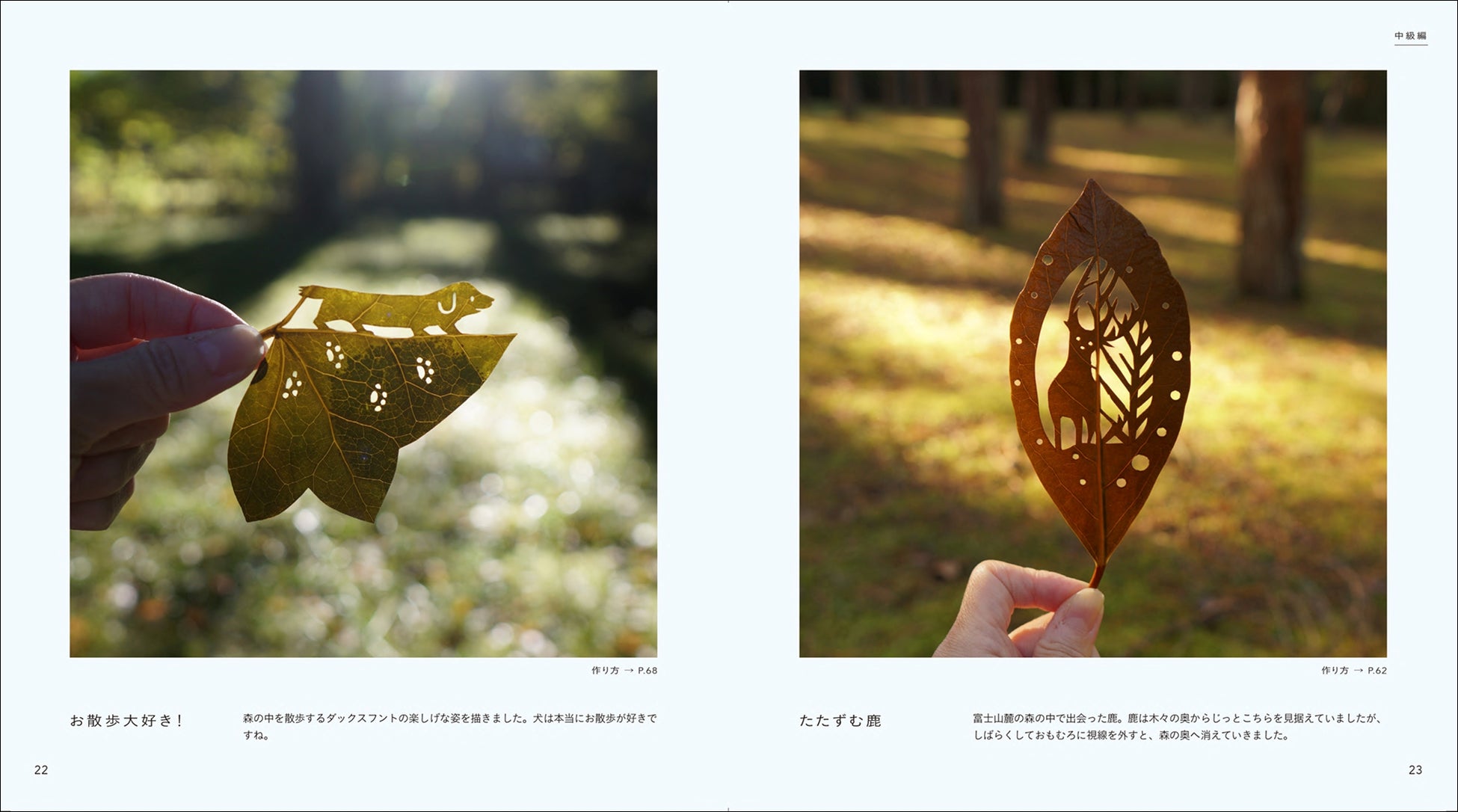 身近にある葉っぱを使い、その葉の中に森と動物たちの世界を切り抜きます。用意するのは、葉っぱとカッターなど、すぐに入手できるもの。下準備や、基本の切り方など初級の図案から丁寧に解説しているので、思い立ったらすぐに始められ、徐々に中級、上級とチャレンジしていけるのも本書の魅力です。