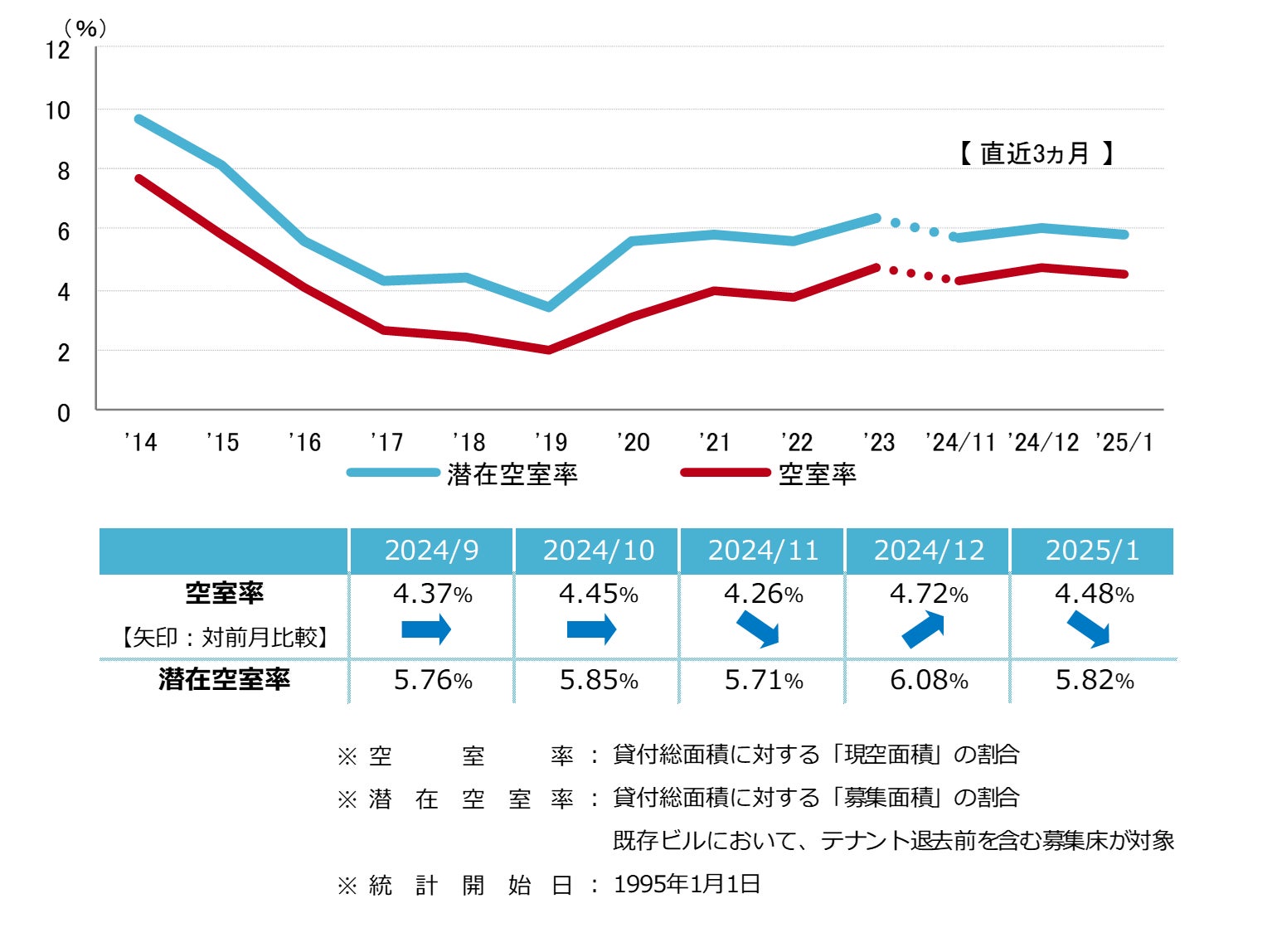 空室率は前月比マイナス0.24ポイントの4.48%と、前月から低下した。主要エリアでの館内増床や大口の一時需要等により空室消化が進み、主な低下要因となっている。潜在空室率は前月比マイナス0.26ポイントの5.82%となった。