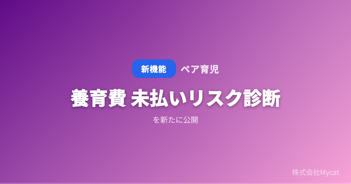 株式会社Mycat(本社:東京都目黒区)は2026年4月14日、離婚後の共同子育て支援サービス「ペア育児」(https://pear-ikuji.com)に、養育費の取り決め内容から未払いリスクをAIが判定する「養育費 未払いリスク診断」を公開しました。養育費の金額、合意の形式、支払いスケジュールなどを入力するだけで、履行確保の強度をA〜Dの4段階で判定し、リスクを下げるための具体的な対策を提示します。
