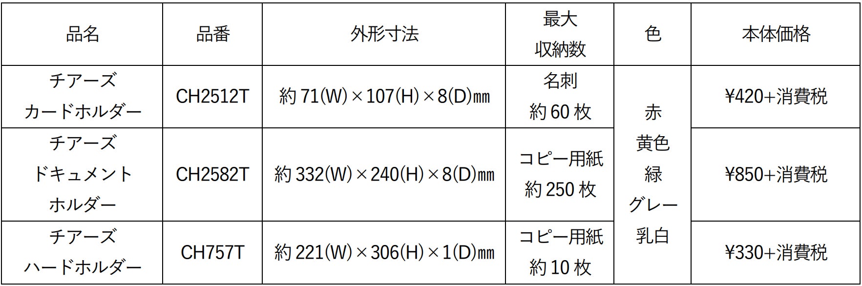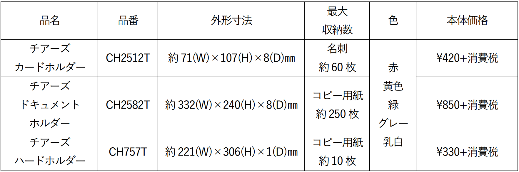 製品名 :チアーズ カードホルダー、チアーズ ドキュメントホルダー