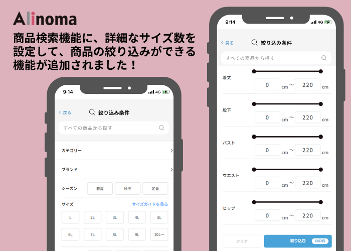 Alinomaでは、かねてから商品検索機能の向上に取り組んでおり、10種類の条件(カテゴリー、ブランド、シーズン、表示サイズ、入荷状況、性別、販売状況、在庫状況、価格帯、カラー)での詳細検索が可能でした。