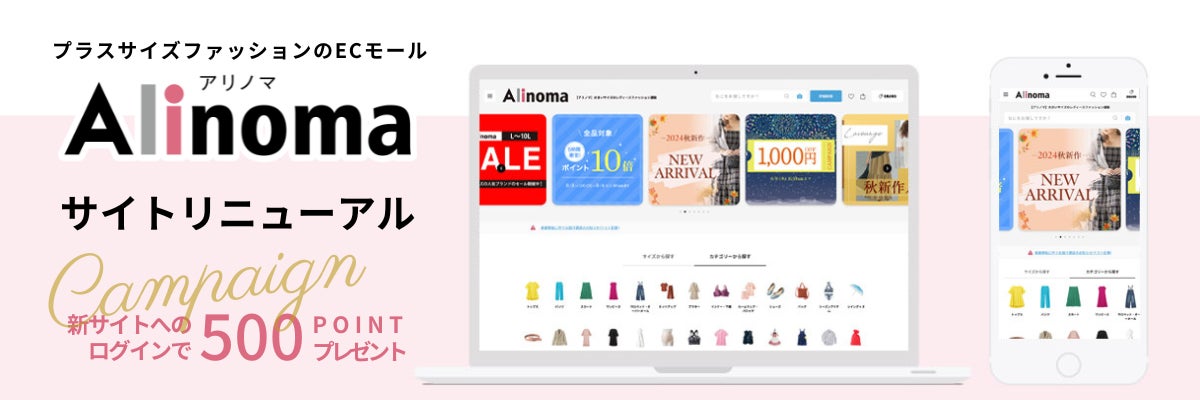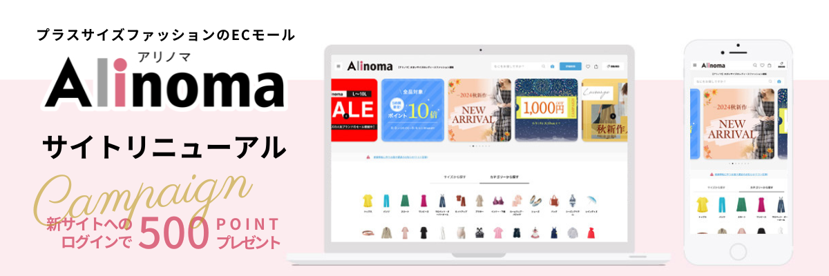 株式会社ニッセン(本社:京都市南区、代表取締役社長:羽渕 淳)が2017年にサービスを開始したプラスサイズファッションECモール『Alinoma(アリノマ)』(https://alinoma.jp)は、オンラインショップをリニューアルオープンいたしました。サイトリニューアルを記念した特別セールを、9月26日(木)AM10:59まで実施中です。