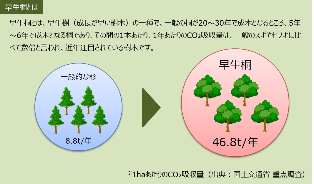 本事業は、成田空港周辺の約1,700㎡の傾斜地に早生桐を80本程度植樹し、成長に伴って吸収するCO₂の環境価値化及び成木の販売による収益化により、持続可能な施策とすることを目指して実証を行うもので、国内空港初の取り組みとなります。