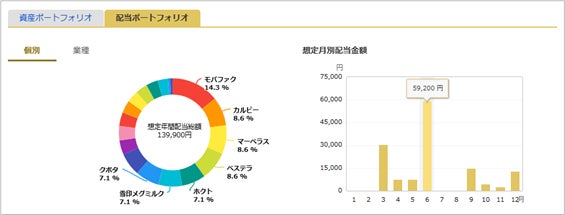 保有銘柄の想定年間配当総額に対する構成比率を表す円グラフと月別の想定配当金額を表す棒グラ
