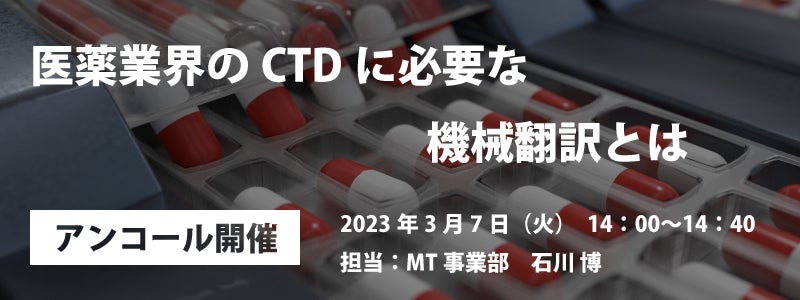 高精度AI自動翻訳の開発・運営を行う株式会社ロゼッタ(本社:東京都千代田区 代表取締役:渡邊 麻呂)は、無料ウェビナー『医薬業界のCTDに必要な機械翻訳とは』を2023年3月7日(火)に開催いたします。