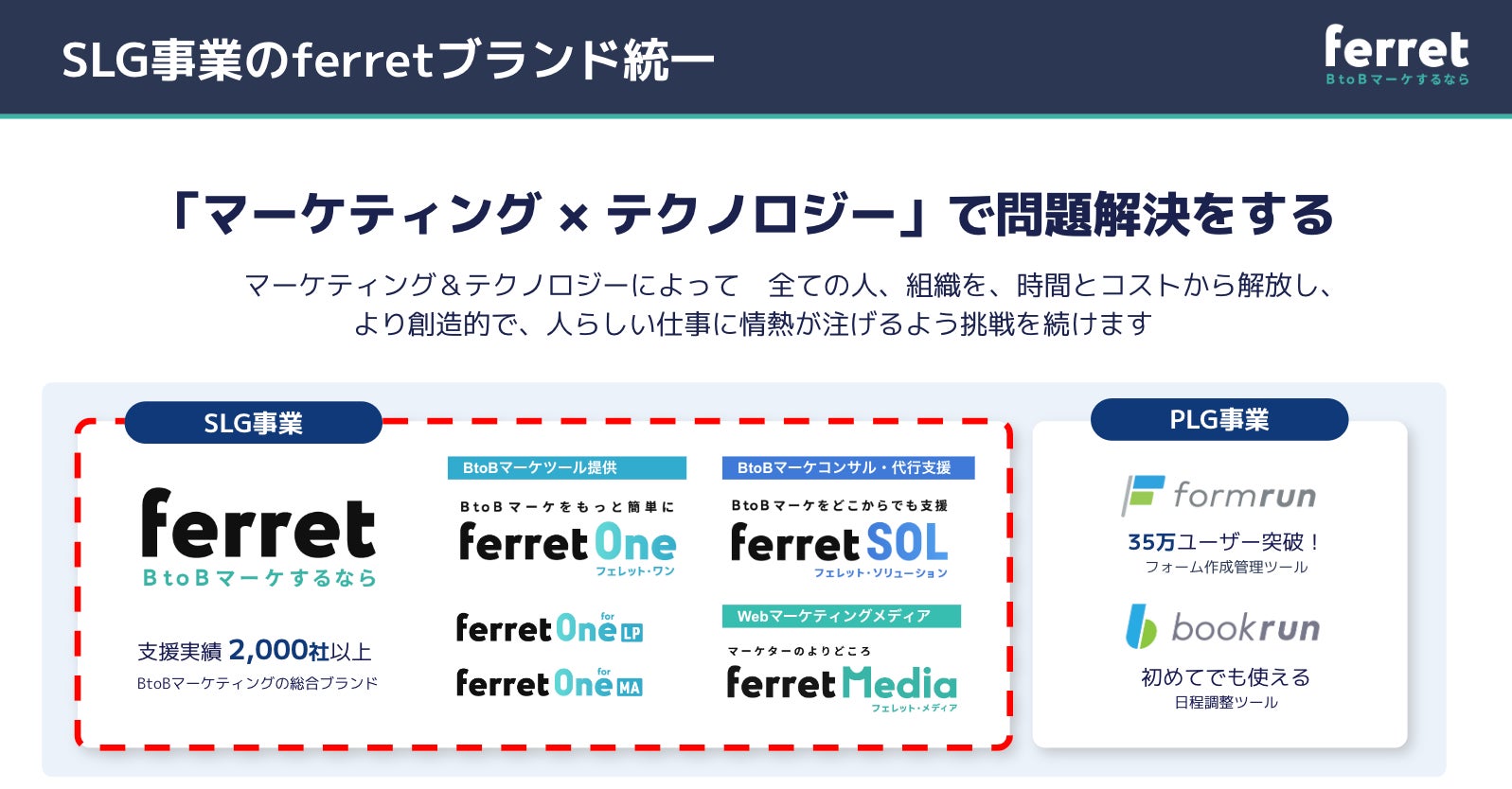 弊社では企業の様々な課題解決に対応するべく複数のサービス・プロダクトを異なるブランド名で展開してまいりました。それぞれのサービス・プロダクトが市場で高い評価を得られた一方で、近年の市場環境の変化や顧客ニーズの多様化に対応するため、統一したブランドでの提供がより効果的であるとの判断に至りました。また、今回統一するブランド名である「ferret」には、当社の「BtoB企業にマーケティング実行力を”もっと”提供したい」という想いを反映し、お客様に対して統一されたメッセージを発信していきます。