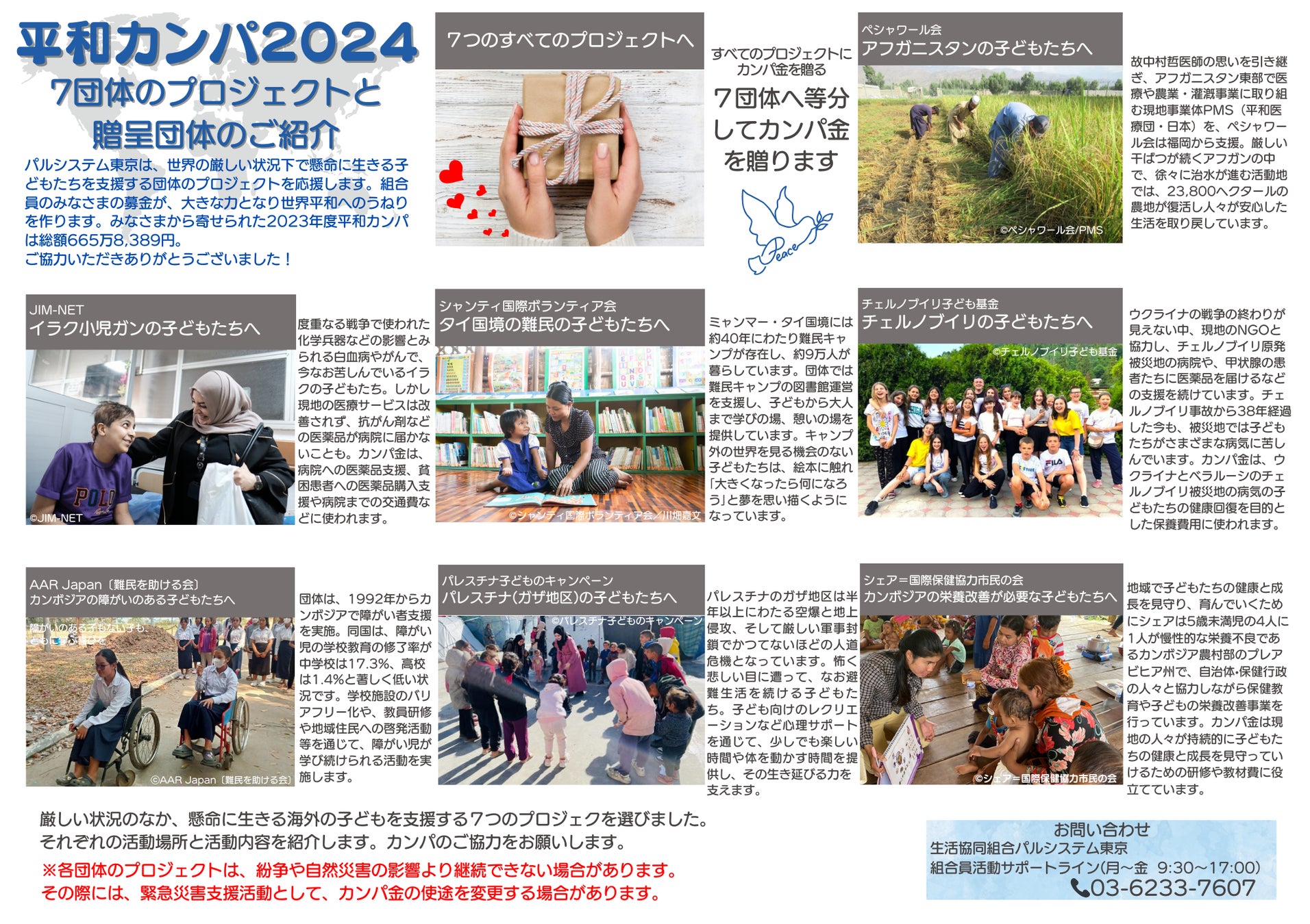 パルシステム東京では1996年から毎年、貧困や飢餓、紛争に苦しむ子どもたちを支援する団体を資金面で応援するための「平和カンパ」を呼びかけています。2023年度は665万8,389円が利用者から寄せられ、7つの団体による世界の子どもたちの支援活動に活用されました。