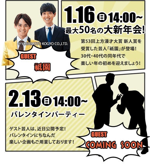 よしもと芸人『祇園』と大新年会!1/16(日)梅田に恋人募集中の男女が集う!