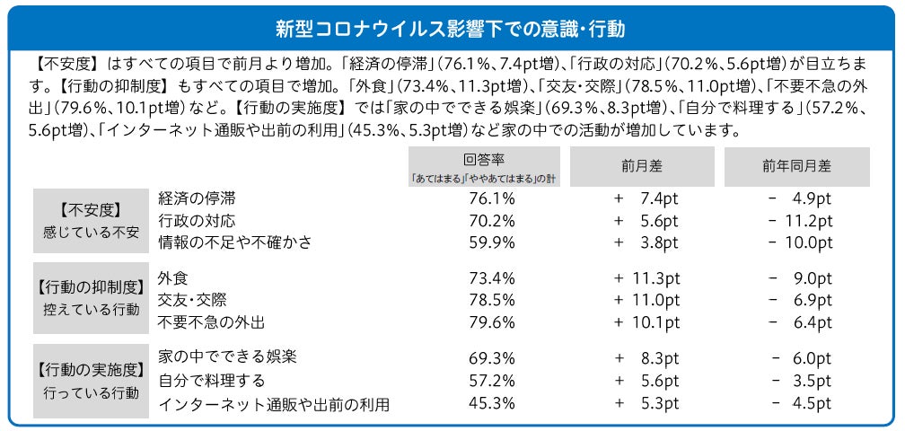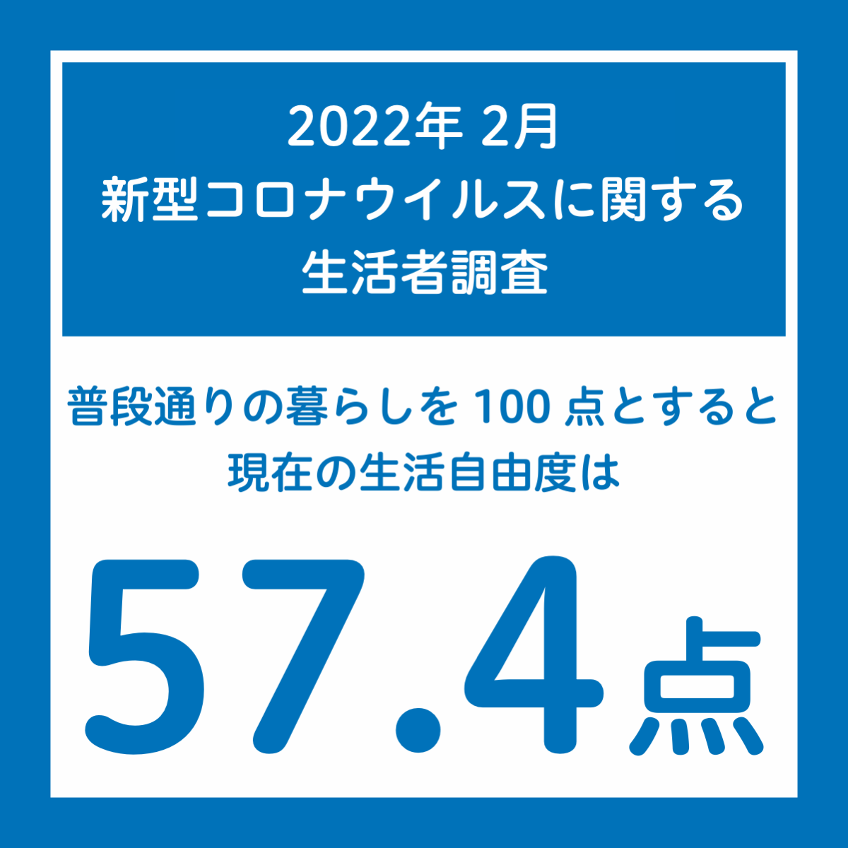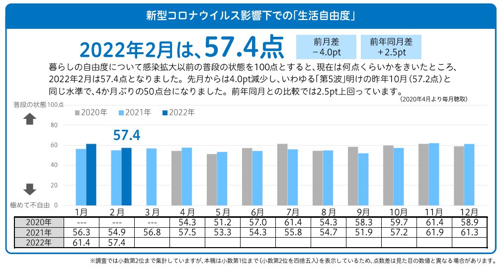 | 2月の「生活自由度」は57.4点で、4か月ぶりに50点台に低下。 「不安」も「行動の抑制」も再び高まる |