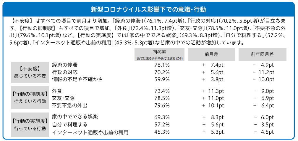 【調査前の状況】1月に入り新型コロナウイルスの感染者数は急増を続け、月末に全国で8万人を突破、最高で2万人強だった昨夏の「第5波」をはるかに上回りました。まん延防止等重点措置の適用も1月下旬には34都道府県に急拡大しました。主となるオミクロン株は、デルタ株より重症化率は低い一方感染力が高いと言われ、特に子どもなど若年層への感染も顕著です。感染者・濃厚接触者の大幅増が、医療だけでなく家庭、仕事、社会機能に大きな影響を及ぼしているとの報道が目立つ環境下での調査です。