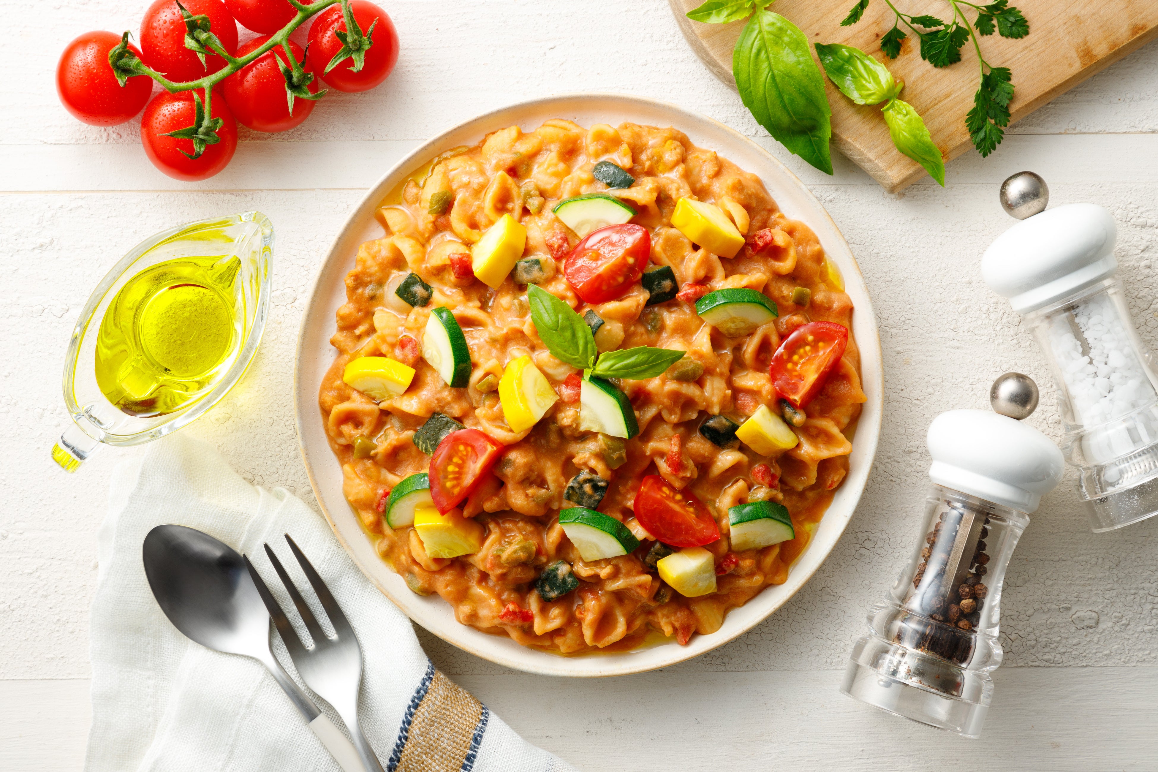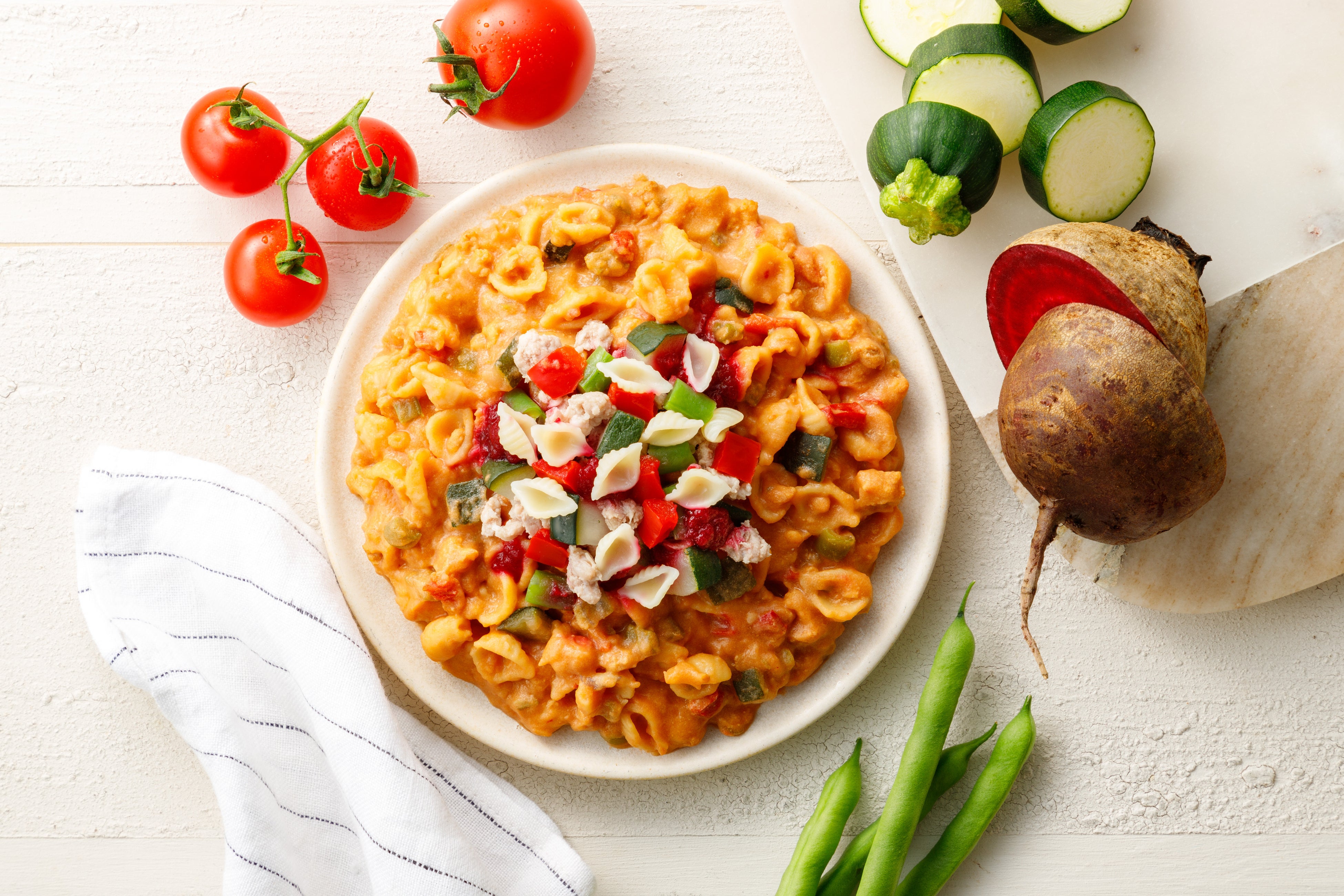 パプリカやズッキーニなどの6種の野菜と豚肉を使用し、トマトベースのパスタに仕上げました。ショートパスタを使用することでわんちゃんも人も食べやすくなっています。