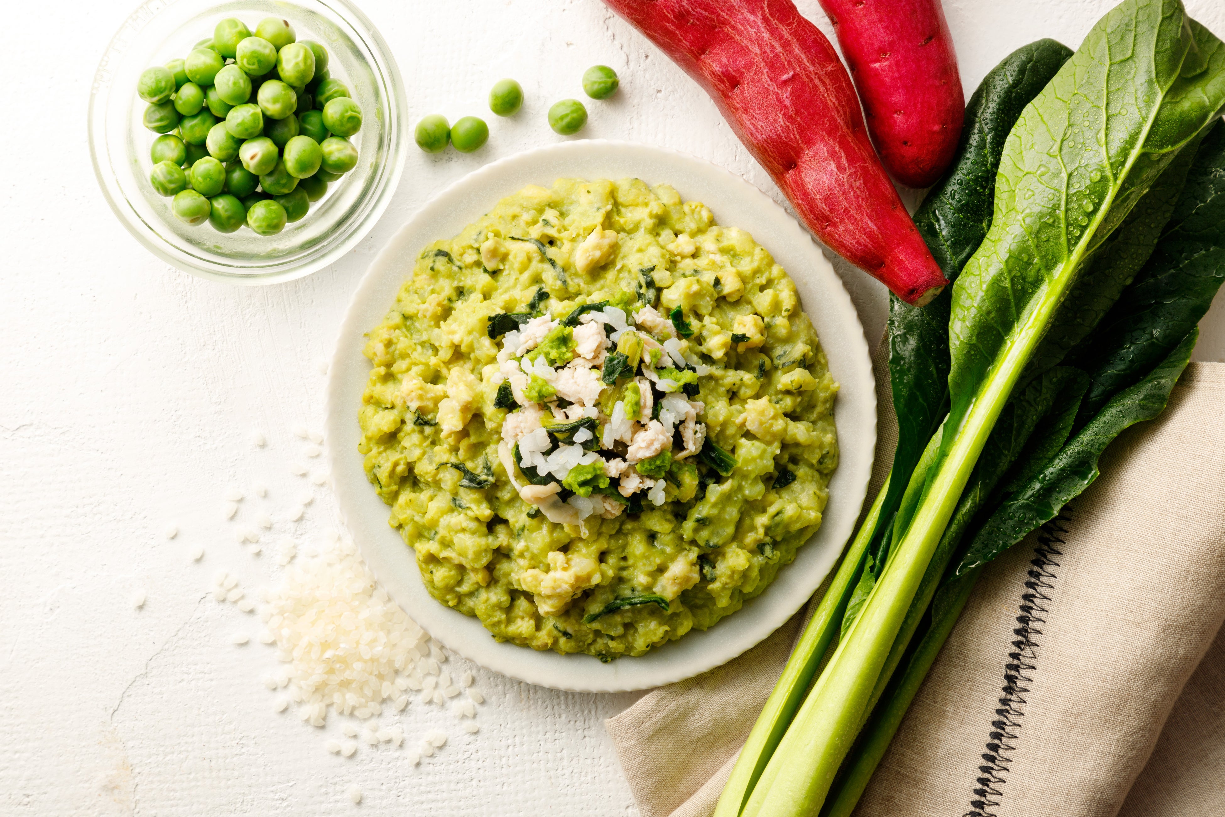 色鮮やかなグリンピースと甘味のあるさつまいも、わんちゃんに人気の鶏むね肉をリゾット風に仕上げました。まろやかな味わいです。