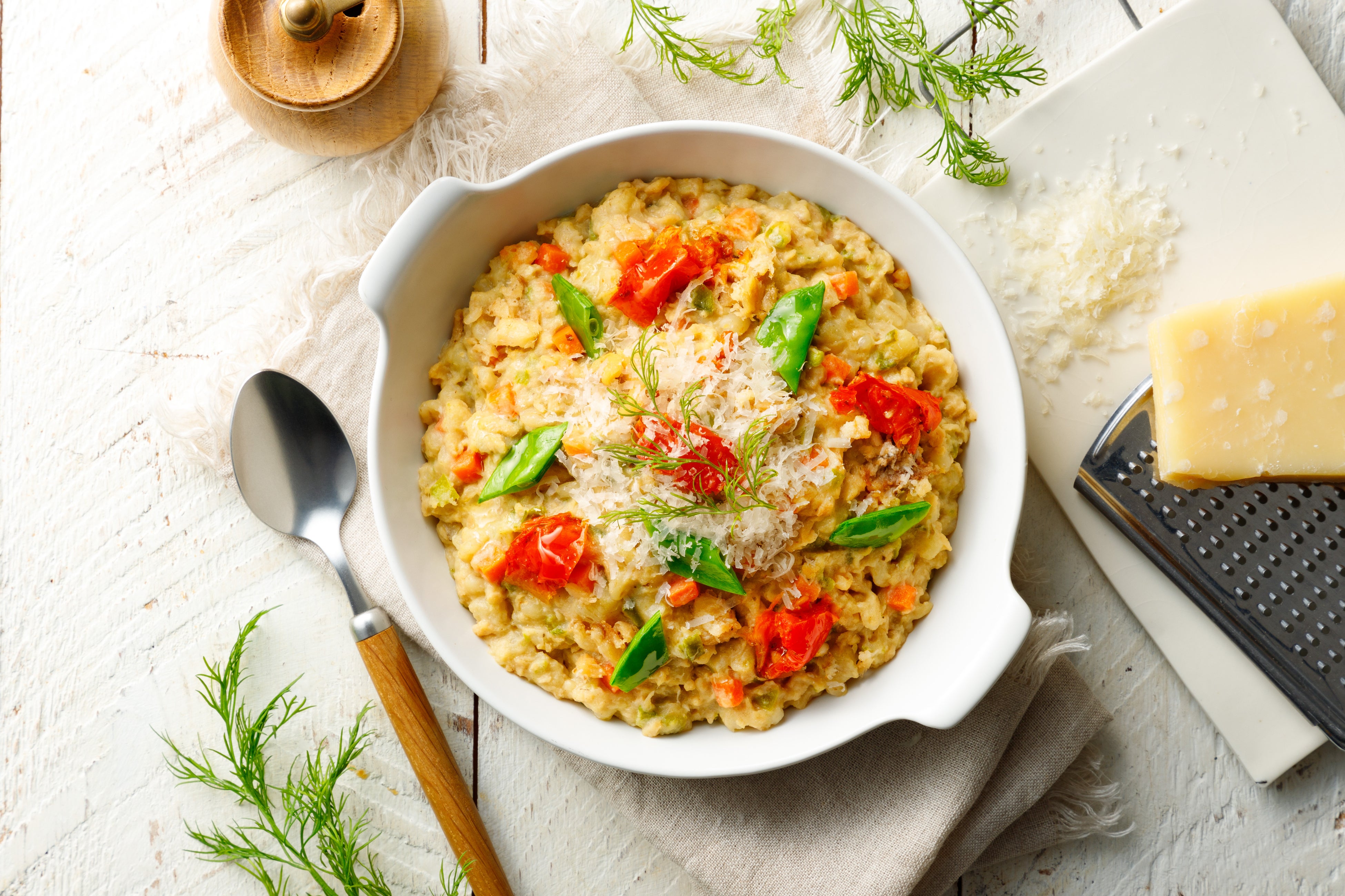 鯛と彩り野菜を、香り高いチーズや鰹節と合わせて大麦リゾット風にしました。お魚好きにはたまらない一品です。