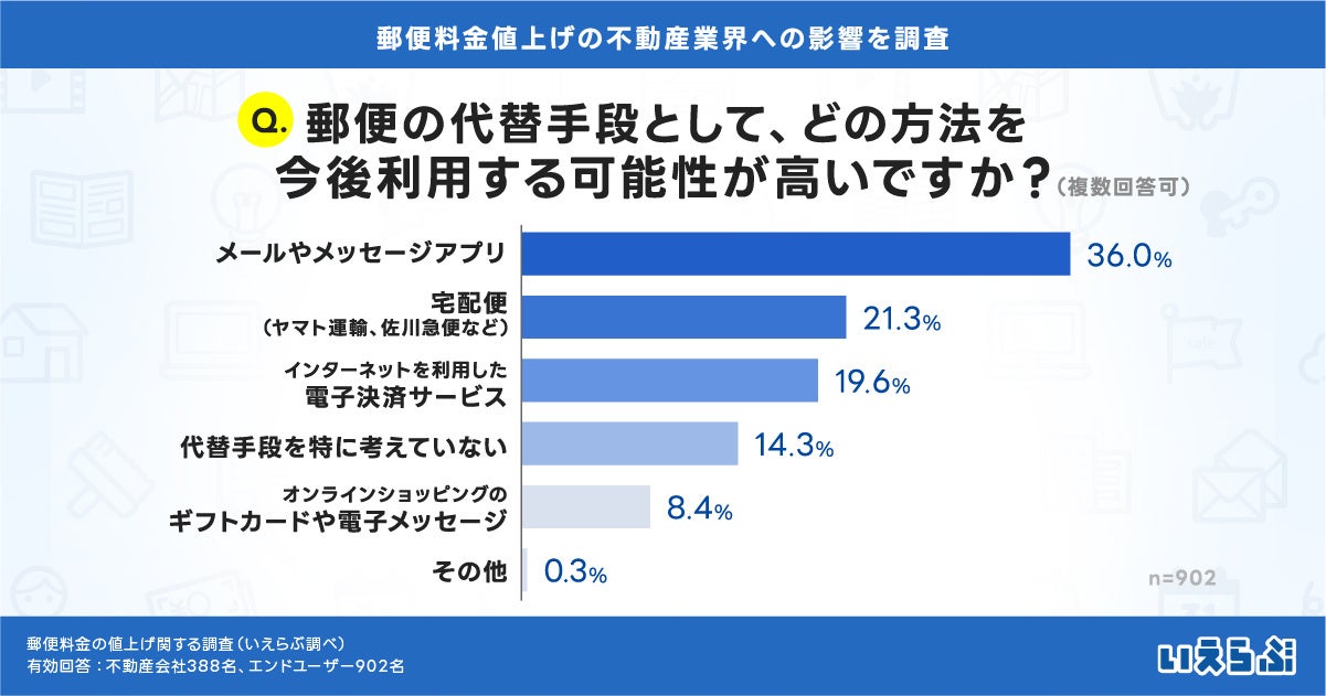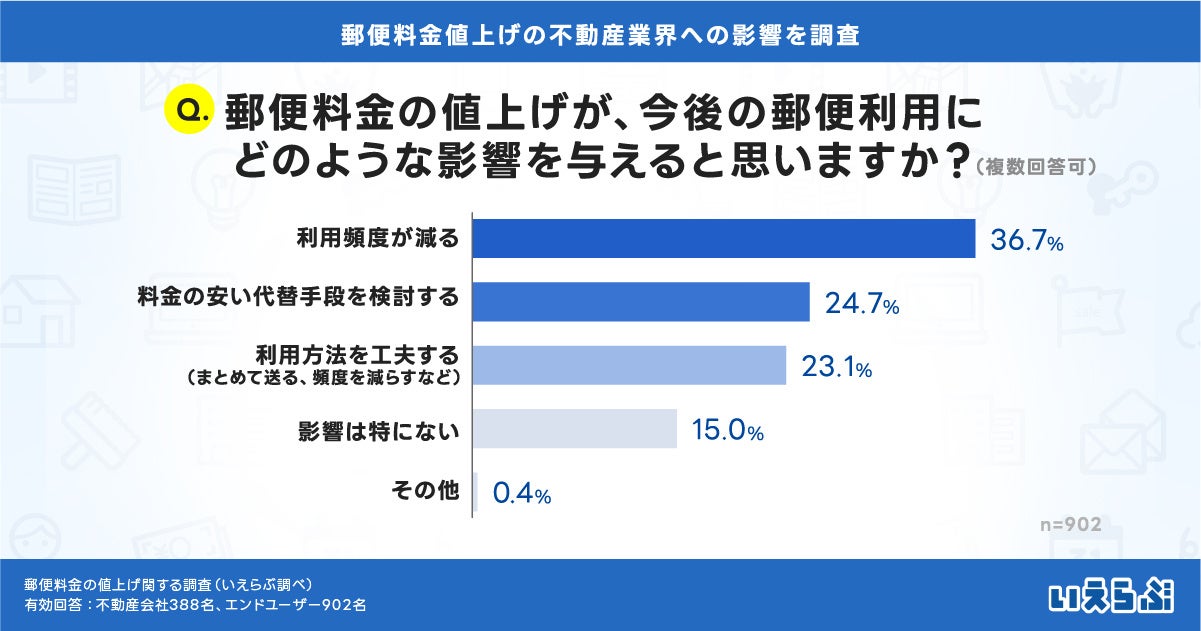 不動産業界のDXに取り組む株式会社いえらぶGROUP(本社:東京都新宿区、代表取締役:岩名泰介、以下「いえらぶGROUP」)は、2024年10月1日に郵便料金が値上げ(※1)されたことを受け、「郵便料金の値上げに関する調査」を行いました。有効回答数1,290名(不動産会社388名、エンドユーザー902名)の調査結果を発表します。