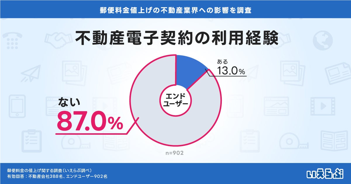 一方で、不動産電子契約の利用経験については依然として低い状況が続いており、87.0%のエンドユーザーがこれまで電子契約を「利用したことがない」と回答しています。しかし、郵便料金の値上げを機に電子契約を導入する不動産会社が増えることが予想されます。