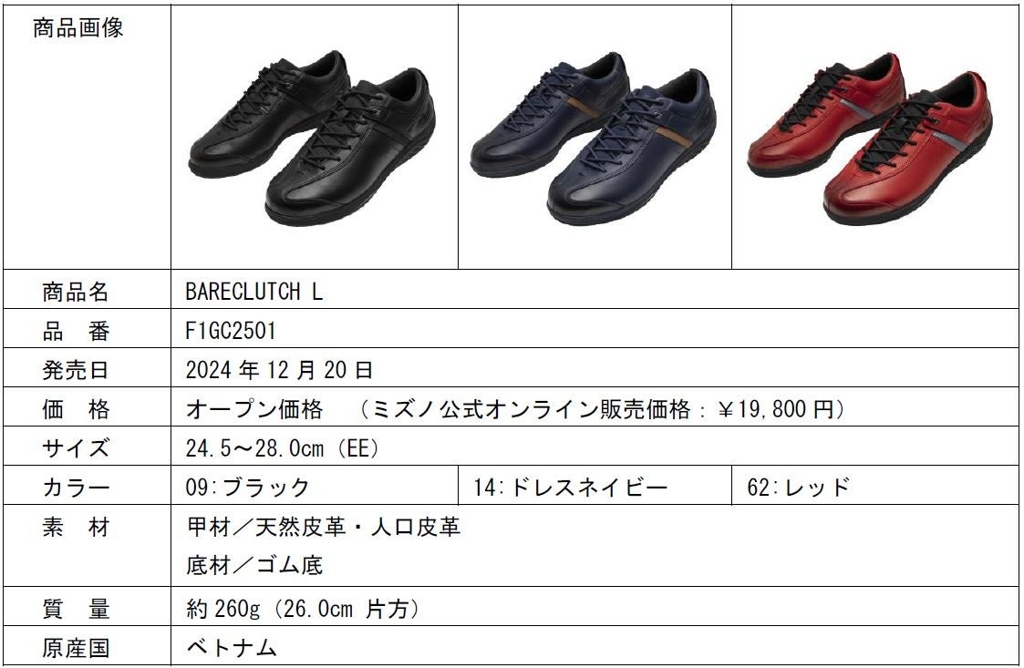 ミズノは、ソールにクルマの運転操作サポート機能を搭載し、アッパーに高級感ある天然皮革を初めて採用した「BARECLUTCH L(ベアクラッチ エル)」を、ミズノ公式オンライン、一部のミズノ品取扱店で2024年12月20日に発売します。