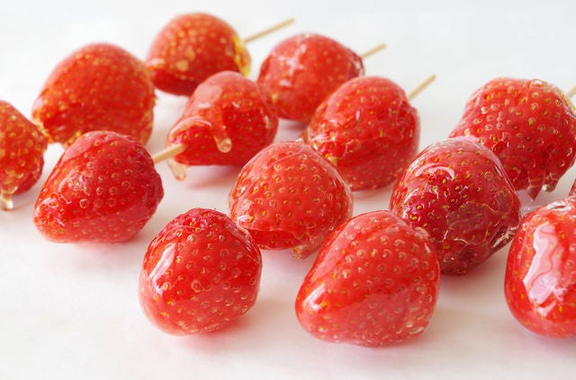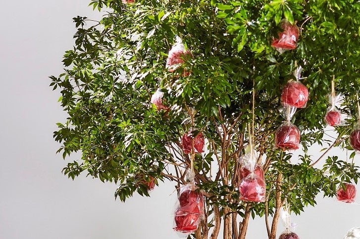 レストランの中央に苺飴を吊り下げた“苺の木”を設置し、非日常&フォトジェニックな空間に。苺飴はお好きなものを取っていただき、お召し上がりいただけます。