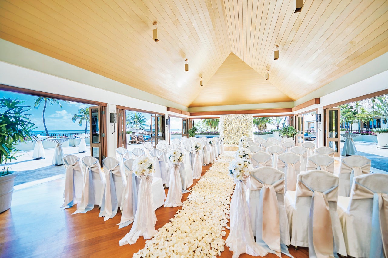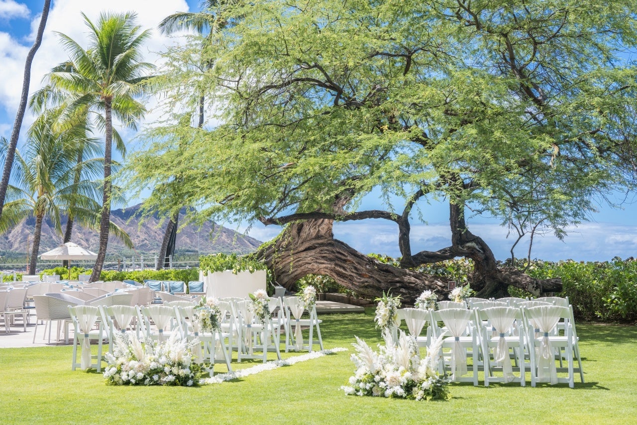 今回、新たに取り扱いを開始する挙式会場「カヴェヘヴェヘ・ウエディング・アット・ハレクラニ」では、青く美しい「グレイズ ビーチ」を望むことができます。「ハレクラニ」前に広がるこの海は、古代ハワイアンや王が病を治療したといわれる神聖なエリアで、「カヴェヘヴェヘ(Kawehewehe・病気の除去の意味)」と呼ばれ、ハワイで古くから伝わるヒーリングスポットとして有名です。セレモニーを行うガーデンには、「ハレクラニ」の象徴のひとつである樹齢130年を超える“キアヴェの木”が佇み、おふたりの門出を見守ります。また、挙式会場の装飾には、ハレクラニ開業以来のコンセプトである「セブン シェイド オブ ホワイト(seven shades of white)– 7色の白」のデザイン哲学を継承した、当社オリジナルのフラワーコーディネートを施しました。