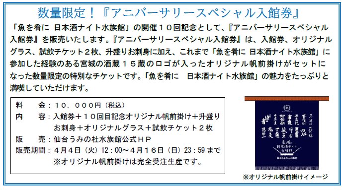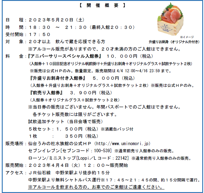 | 日 程:2023年5月20日(土) 時 間:18:30 ~ 21:30(最終入館20:30) 受付開始:17:50 対 象:20才以上 飲んで蔵を応援できる方 ※アルコール販売がありますので、20才未満の方のご入館はできません。 料 金:『アニバーサリースペシャル入館券』 10,000円(税込) (入館券+10回目記念オリジナル帆前掛け+升盛りお刺身+オリジナルグラス+試飲チケ ット2枚) ※販売は公式HPのみ。数量限定。販売期間は4/4 12:00~4/16 23:59まで。 『升盛りお刺身付き入館券』 5,000円(税込) (入館券+升盛りお刺身+オリジナルグラス+試飲チケット2枚)※販売は公式HPのみ。 『前売り入館券』 3,900円(税込) (入館券+オリジナルグラス+試飲チケット2枚) ※当日券の販売はございません。年間パスポートでのご入館はできません。 各チケット販売数には限りがございます。 試飲追加チケット(当日会場で販売) 5枚セット:1,500円(税込)※酒蔵缶バッジ付 1枚 : 350円(税込) 販売場所:仙台うみの杜水族館の公式HP(http://www.uminomori.jp) セブンイレブン[セブンコード:100-539] ※通常前売り入館券のみの販売。 ローソン/ミニストップ[Loppi/Lコード:22142] ※通常前売り入館券のみの販売。 販売開始:2023年4月4日(火)12:00~販売開始 アクセス:JR仙石線 中野栄駅より徒歩約15分 中野栄駅より無料シャトルバス運行※17:45~21:45の間、約15分間隔で運行。 ※アルコールを飲まれる方の、お車でのご来館はご遠慮ください。 |
