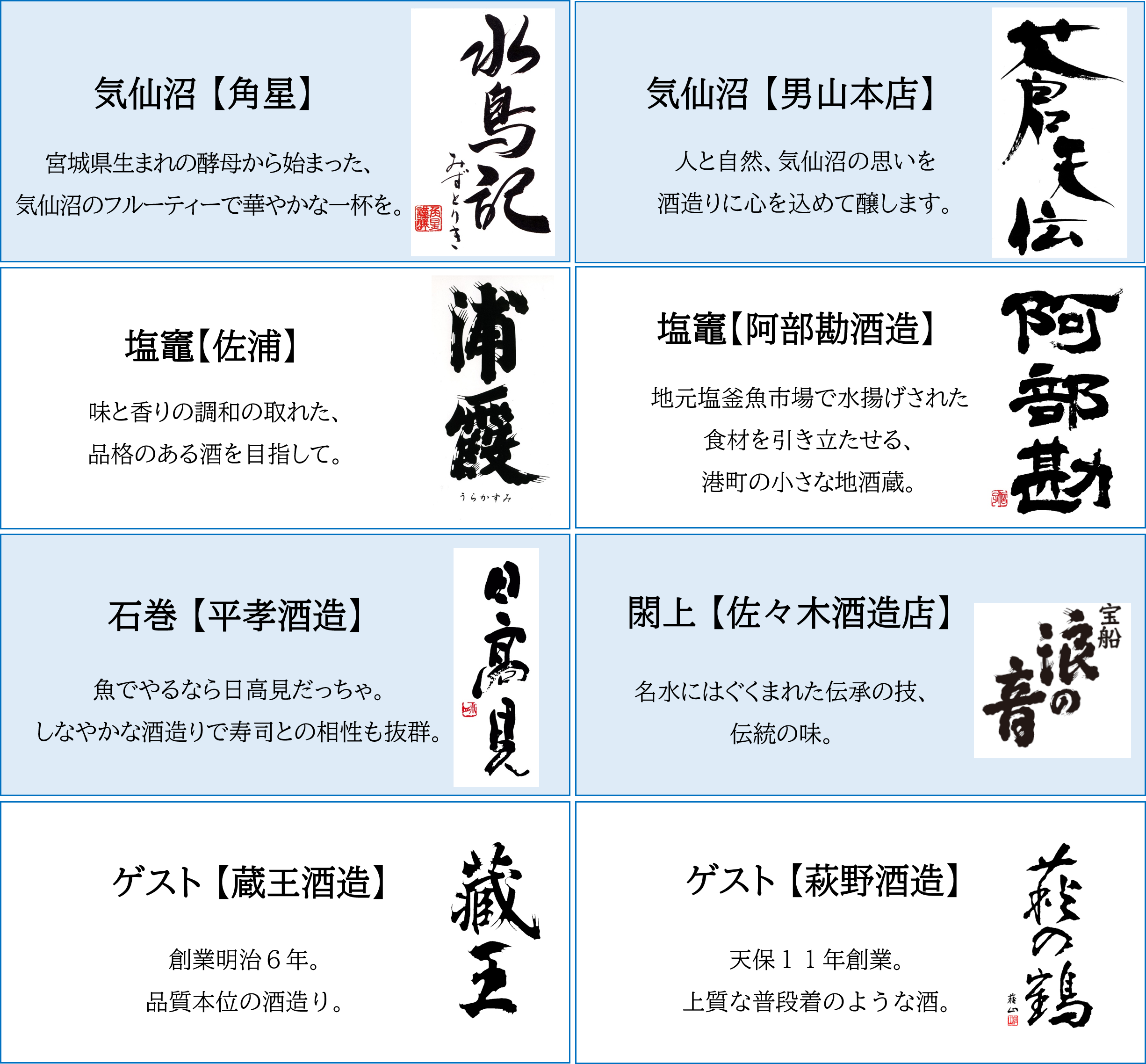 - 参加酒蔵~宮城を代表する8つの酒蔵が集結~