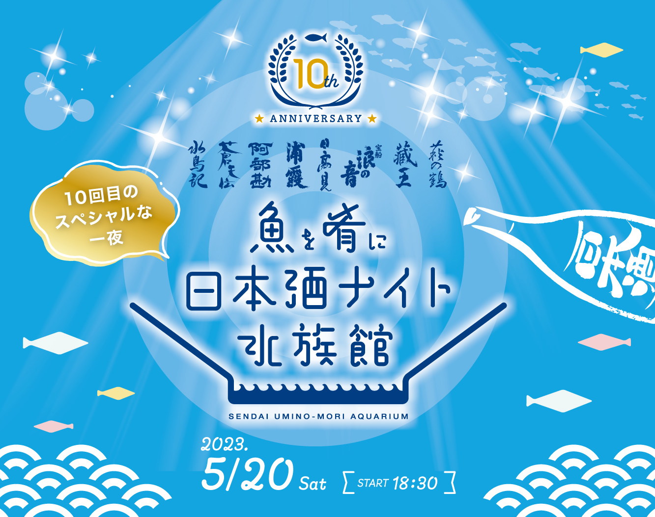 海と人、水と人との、新しい「つながり」をうみだす水族館、『仙台うみの杜水族館』では、2023年5月20日(土)の閉館後、復興支援企画「魚を肴に 日本酒ナイト水族館」を開催いたします。宮城を代表する酒蔵の日本酒を片手に、幻想的な夜の水族館をお楽しみいただける大人のためのナイトイベントです。