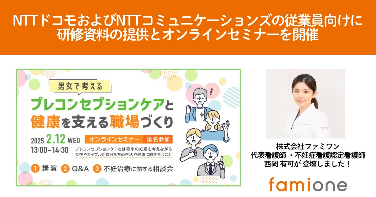 「子どもを願うすべての人によりそい 幸せな人生を歩める社会をつくる」をビジョンに掲げ、法人の従業員向け福利厚生や自治体の住民向け支援を行うヘルスケアサポートサービス「ファミワン」 https://famione.com/benefit/ などを展開する株式会社ファミワン(本社:東京都渋谷区、代表取締役:石川勇介)は、株式会社NTTドコモおよびNTTコミュニケーションズ東海・北陸・関西グループ(以下、ドコモグループ)の従業員向けに、オンラインセミナー「普段の暮らしと妊活、どうつながる?健康診断から見える自分の体と心のこと~健康から考える職場づくりのいろは~」を2025年2月12日に開催いたしました。