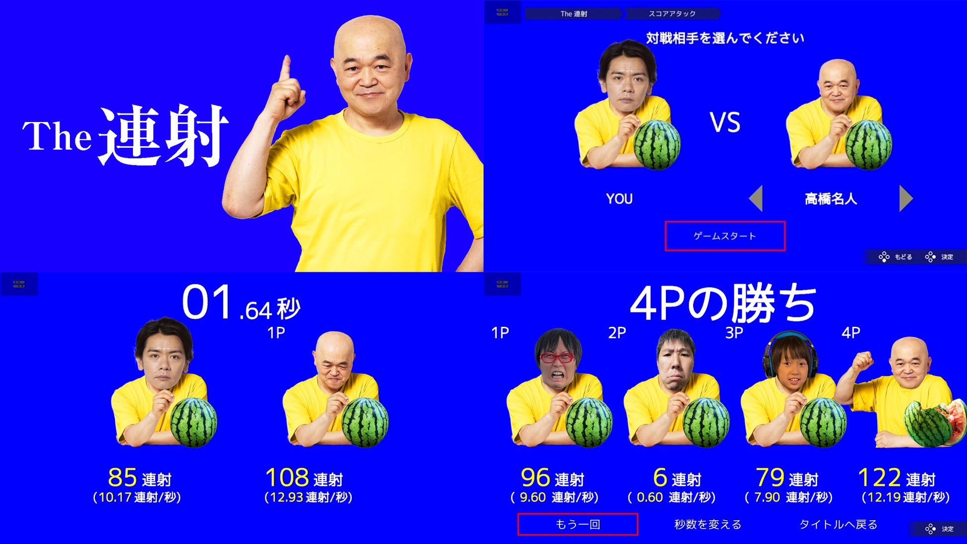 あの高橋名人とコラボした、ひたすら連射の速さを競うゲームです。制限時間内に、より多くボタンを連射できた方が勝ち。高橋名人(COM)と対戦することもできます。