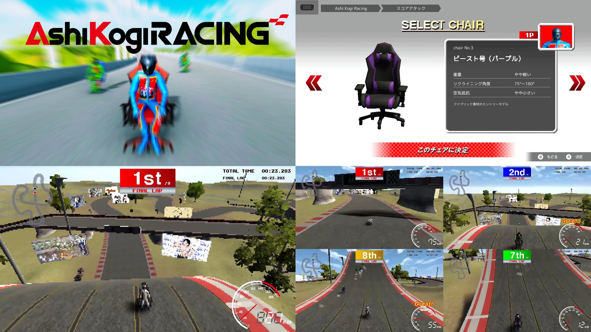 ゲーミングチェアでおなじみ、AKRacing様の出資によって誕生した、椅子に座って進むレースゲームです。タイミングよく地面を蹴ったり、空気抵抗を減らすためにリクライニングを駆使しながら、サーキットや山道などのコースを駆け抜けます。